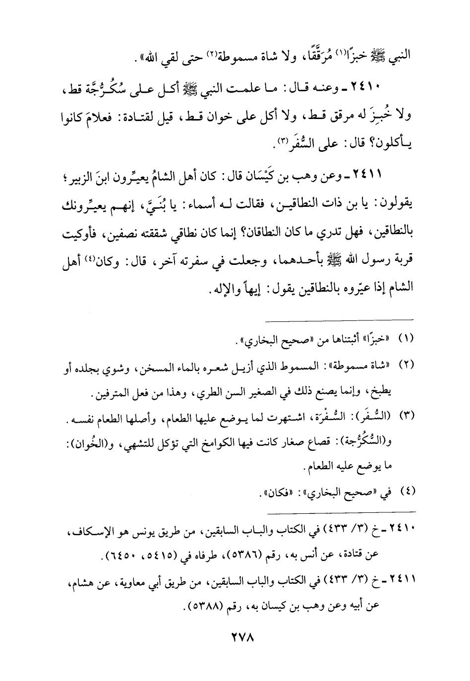 2410 - وعنه قال: ما علمت النبي -صلى اللَّه عليه وسلم- أكل على سُكُرُّجَّة قط، ولا خُبِزَ له مرقق قط، ولا أكل على خوان قط، قيل لقتادة: فعلامَ كانوا يأكلون؟ قال: على السُّفَر (¬3).