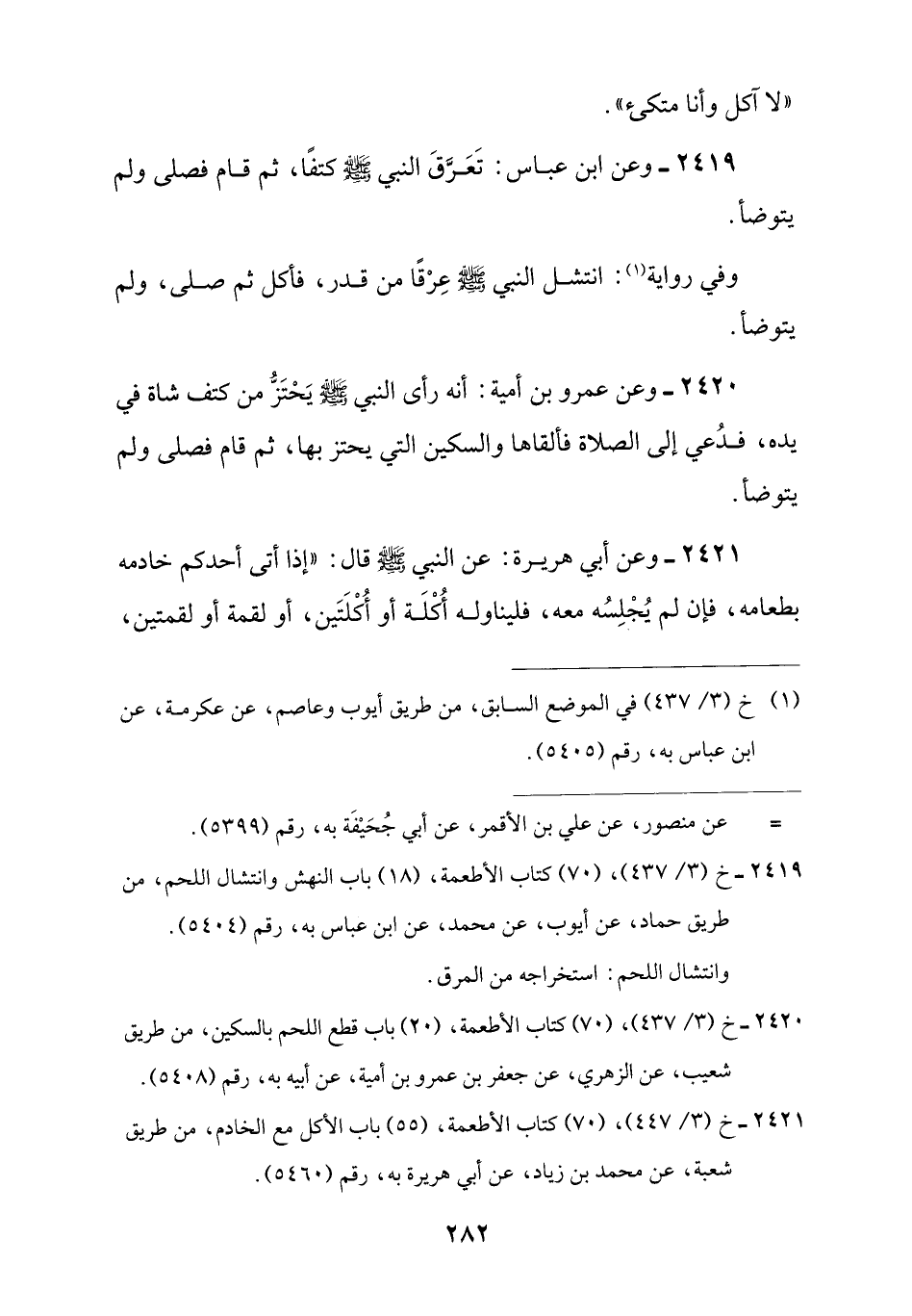 2419 - خ (3/ 437)، (70) كتاب الأطعمة، (18) باب النهش وانتشال اللحم، من طريق حماد، عن أيوب، عن محمد، عن ابن عباس به، رقم (5404). وانتشال اللحم: استخراجه من المرق.