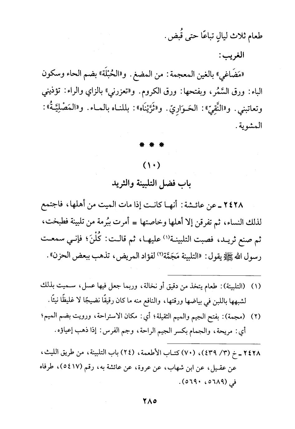 2428 - خ (3/ 439)، (70) كتاب الأطعمة، (24) باب التلبينة، من طريق الليث، عن عقيل، عن ابن شهاب، عن عروة، عن عائشة به، رقم (5417)، طرفاه في (5689، 5690).