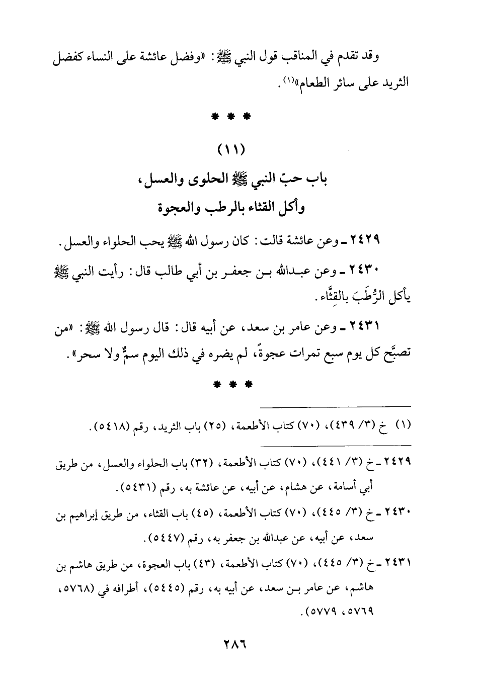 2430 - وعن عبد اللَّه بن جعفر بن أبي طالب قال: رأيت النبي -صلى اللَّه عليه وسلم- يأكل الرُّطَبَ بالقِثَّاء.
