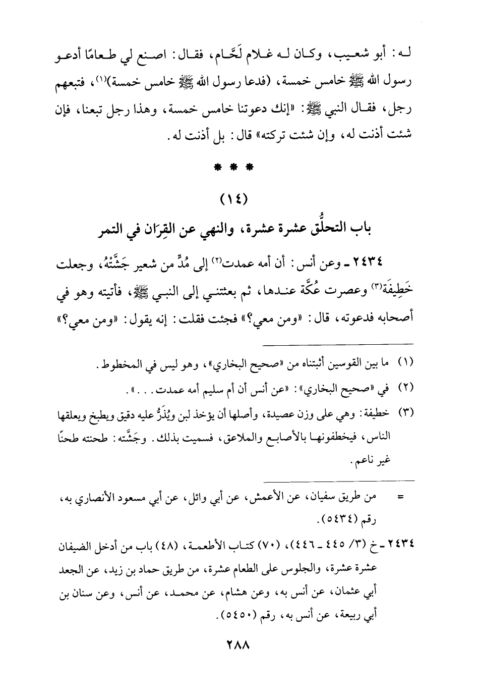 2434 - وعن أَنس: أن أمه عمدت (¬2) إلى مُدٍّ من شعير جَشَّتْهُ، وجعلت خَطِيفَة (¬3) وعصرت عُكَّة عندها، ثم بعثتني إلى النبي -صلى اللَّه عليه وسلم-، فأتيته وهو في أصحابه فدعوته، قال: "ومن معي؟ " فجئت فقلت: إنه يقول: "ومن معي؟ "