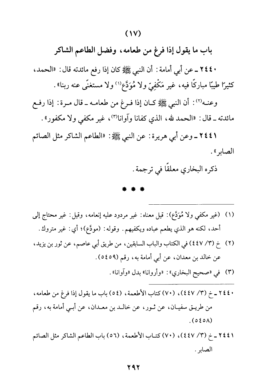(17) باب ما يقول إذا فرغ من طعامه، وفضل الطاعم الشاكر
