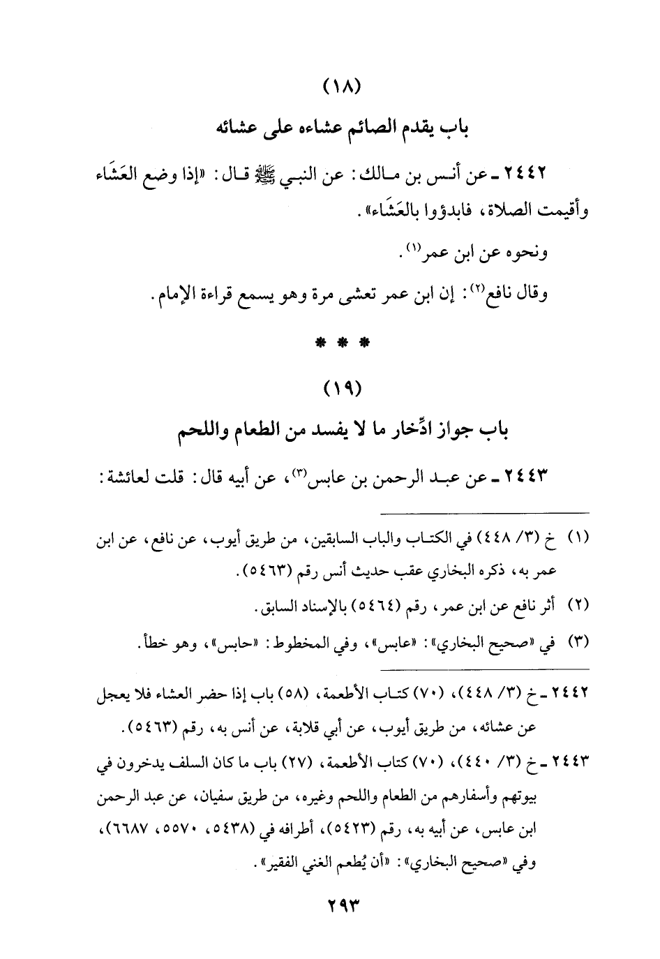 2442 - خ (3/ 448)، (70) كتاب الأطعمة، (58) باب إذا حضر العشاء فلا يعجل عن عشائه، من طريق أيوب، عن أبي قلابة، عن أَنس به، رقم (5463).
