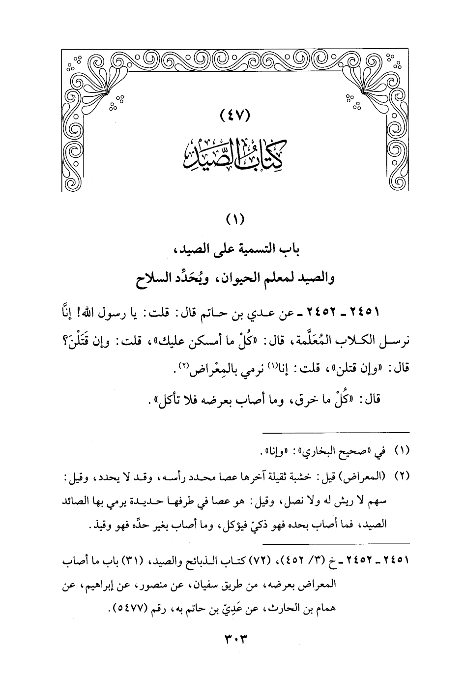 2451 - 2452 - خ (3/ 452)، (72) كتاب الذبائح والصيد، (31) باب ما أصاب المعراض بعرضه، من طريق سفيان، عن منصور، عن إبراهيم، عن همام بن الحارث، عن عَدِيّ بن حاتم به، رقم (5477).