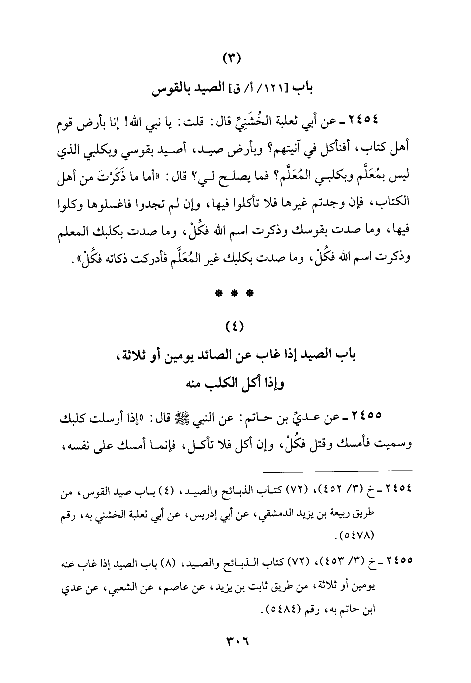 (4) باب الصيد إذا غاب عن الصائد يومين أو ثلاثة، وإذا أكل الكلب منه