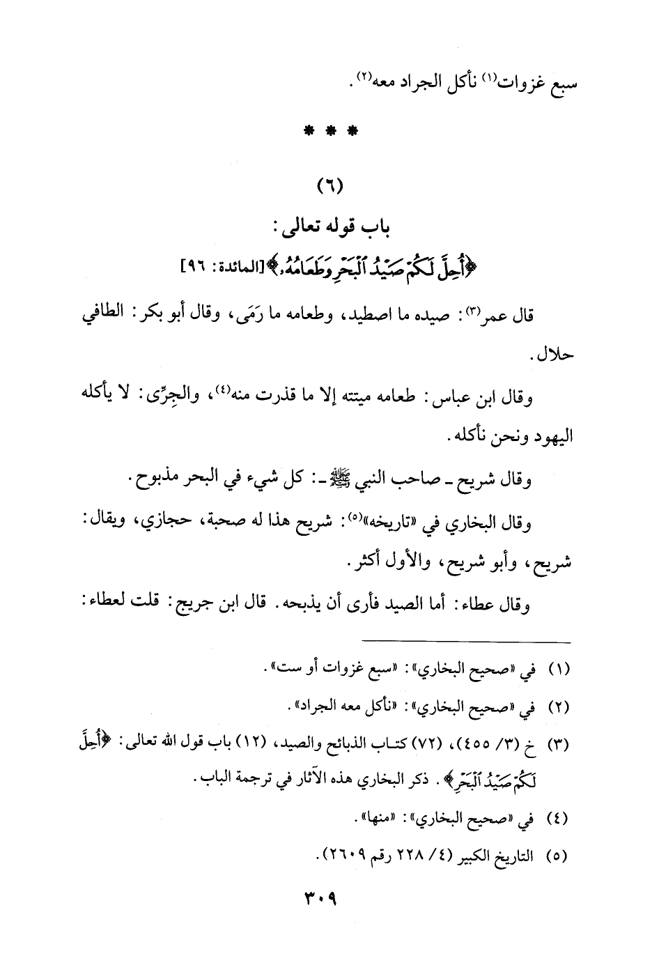(6) باب قوله تعالى: {أُحِلَّ لَكُمْ صَيْدُ الْبَحْرِ وَطَعَامُهُ} [المائدة: 96]