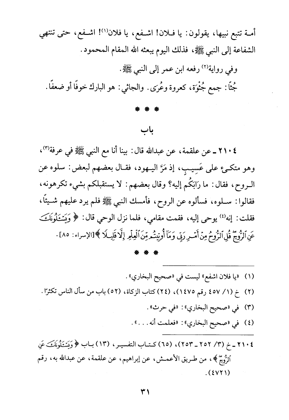 2104 - عن علقمة، عن عبد اللَّه قال: بينا أنا مع النبي -صلى اللَّه عليه وسلم- في عرفة (¬3)، وهو متكئ على عَسِيبٍ، إذ مَرَّ اليهود، فقال بعضهم لبعض: سلوه عن الروح، فقال: ما رَابَكُم إليه؟ وقال بعضهم: لا يستقبلكم بشيء تكرهونه، فقالوا: سلوه، فسألوه عن الروح، فأمسك النبي -صلى اللَّه عليه وسلم- فلم يرد عليهم شيئًا، فقلت: إنه (¬4) يوحى إليه، فقمت مقامي، فلما نزل الوحي قال: {وَيَسْأَلُونَكَ عَنِ الرُّوحِ قُلِ الرُّوحُ مِنْ أَمْرِ رَبِّي وَمَا أُوتِيتُمْ مِنَ الْعِلْمِ إِلَّا قَلِيلًا} [الإسراء: 85].