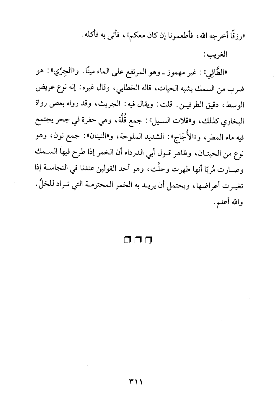 "الطَّافِي": غير مهموز -وهو المرتفع على الماء ميتًا. و"الجِرِّي": هو ضرب من السمك يشبه الحيات، قاله الخطابي، وقال غيره: إنه نوع عريض الوسط، دقيق الطرفين. قلت: ويقال فيه: الجريث، وقد رواه بعض رواة البخاري كذلك، و"قلات السيل": جمع قُلَّة، وهي حفرة في جحر يجتمع فيه ماء المطر، و"الأُجَاج": الشديد الملوحة، و"النينان": جمع نون، وهو نوع من الحيتان، وظاهر قول أبي الدرداء أن الخمر إذا طرح فيها السمك وصارت مُريًا أنها طهرت وحلَّت، وهو أحد القولين عندنا في النجاسة إذا تغيرت أعراضها، ويحتمل أن يريد به الخمر المحترمة التي تراد للخلِّ. واللَّه أعلم.