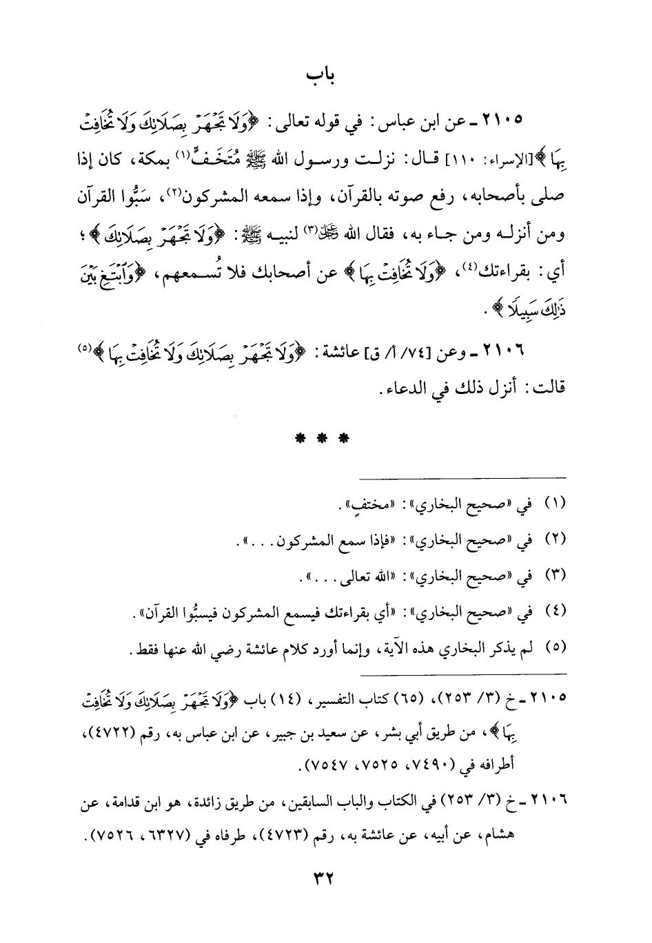 2106 - وعن عائشة: {وَلَا تَجْهَرْ بِصَلَاتِكَ وَلَا تُخَافِتْ بِهَا} (¬5) قالت: أنزل ذلك في الدعاء.