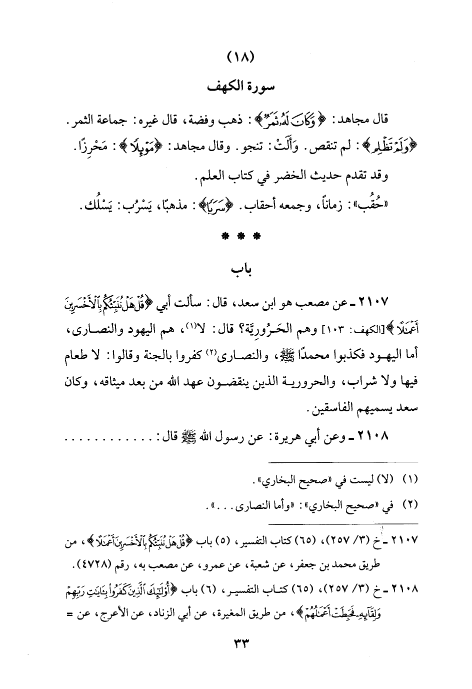 2107 - عن مصعب هو ابن سعد، قال: سألت أبي {قُلْ هَلْ نُنَبِّئُكُمْ بِالْأَخْسَرِينَ أَعْمَالًا} [الكهف: 103] وهم الحَرُورِيَّة؟ قال: لا (¬1)، هم اليهود والنصارى، أما اليهود فكذبوا محمدًا -صلى اللَّه عليه وسلم-، والنصارى (¬2) كفروا بالجنة وقالوا: لا طعام فيها ولا شراب، والحرورية الذين ينقضون عهد اللَّه من بعد ميثاقه، وكان سعد يسميهم الفاسقين.