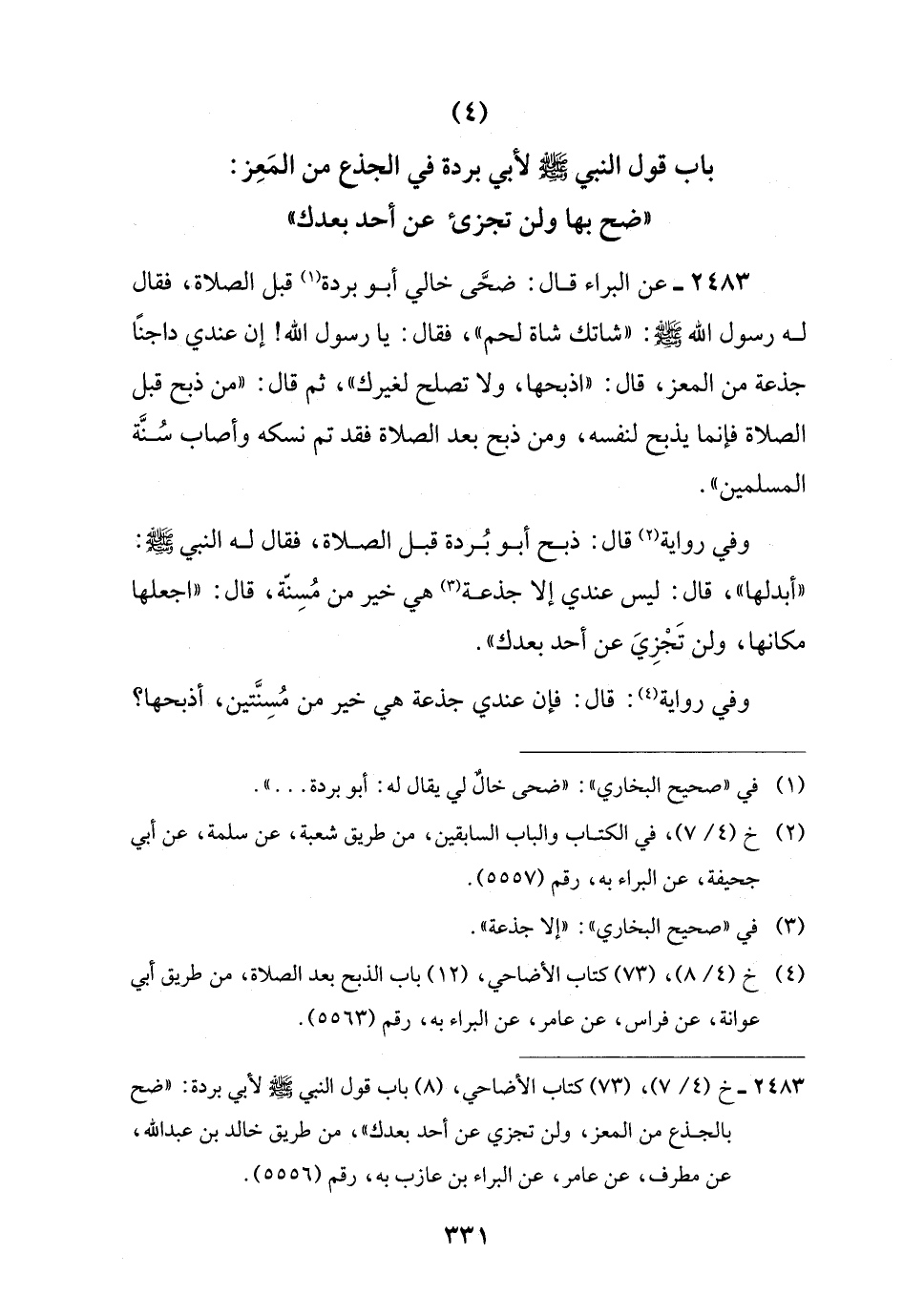 (¬4) خ (4/ 8)، (73) كتاب الأضاحي، (12) باب الذبح بعد الصلاة، من طريق أبي عوانة، عن فراس، عن عامر، عن البراء به، رقم (5563).