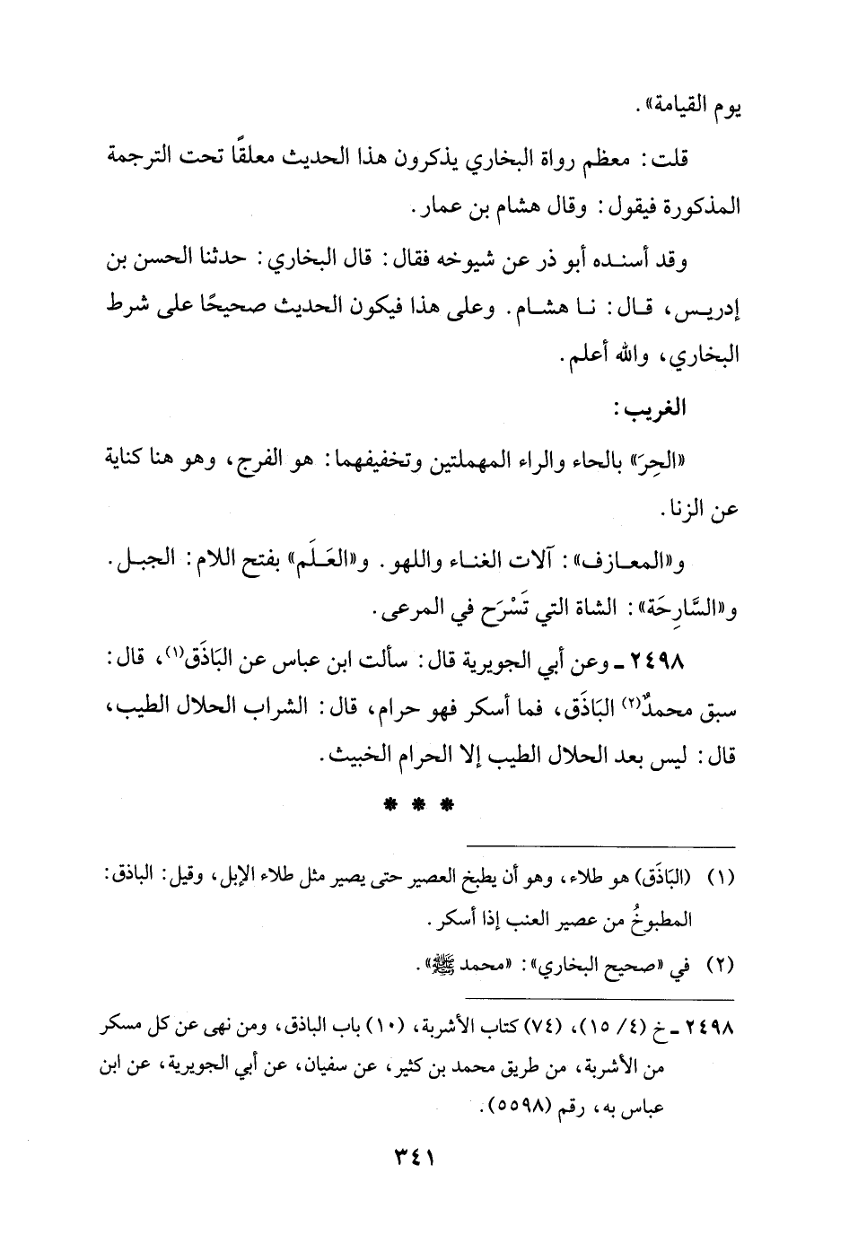 2498 - وعن أبي الجويرية قال: سألت ابن عباس عن البَاذَق (¬1)، قال: سبق محمدٌ (¬2) البَاذَق، فما أسكر فهو حرام، قال: الشراب الحلال الطيب، قال: ليس بعد الحلال الطيب إلا الحرام الخبيث.