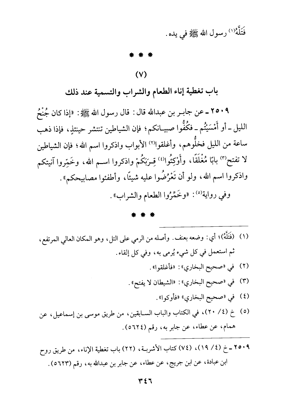 (7) باب تغطية إناء الطعام والشراب والتسمية عند ذلك