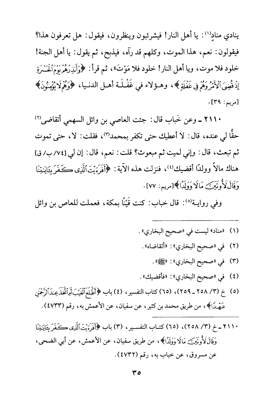 2110 - وعن خَباب قال: جئت العاصي بن وائل السهمي أتقاضى (¬2) حقًّا لي عنده، قال: لا أعطيك حتى تكفر بمحمد (¬3)، فقلت: لا، حتى تموت ثم تبعث، قال: وإني لميت ثم مبعوث؟ قلت: نعم، قال: إن لي هناك مالًا وولدًا أقضيك (¬4)، فنزلت هذه الآية: {أَفَرَأَيْتَ الَّذِي كَفَرَ بِآيَاتِنَا وَقَالَ لَأُوتَيَنَّ مَالًا وَوَلَدًا} [مريم: 77].