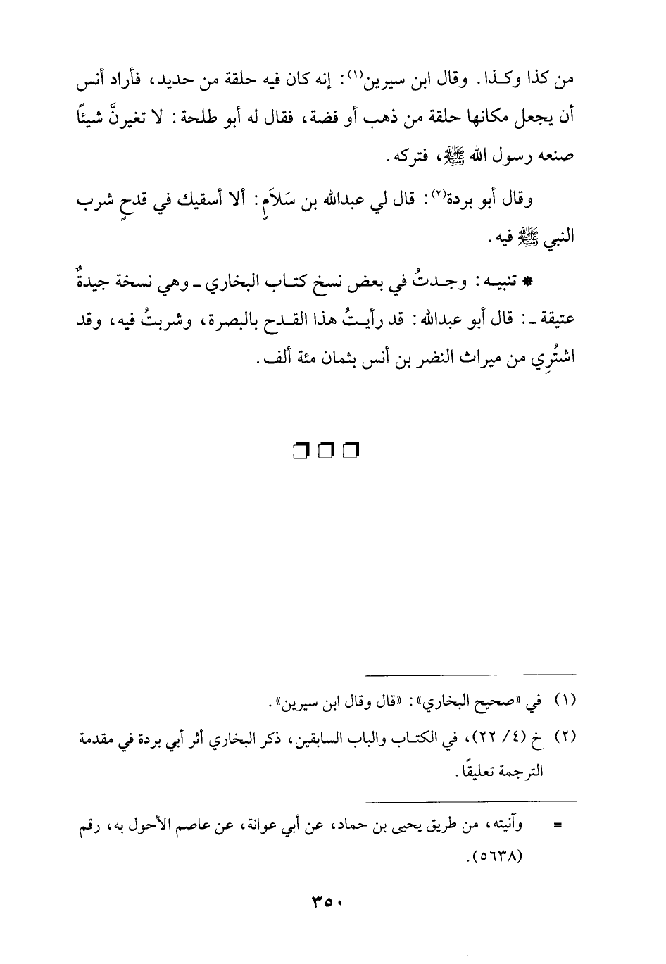 * تنبيه: وجدتُ في بعض نسخ كتاب البخاري -وهي نسخة جيدةٌ عتيقة-: قال أبو عبد اللَّه: قد رأيتُ هذا القدح بالبصرة، وشربتُ فيه، وقد اشتُرِي من ميراث النضر بن أنس بثمان مئة ألف.