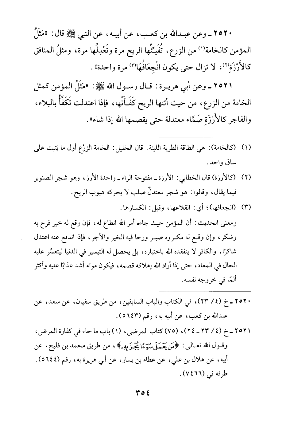 2520 - وعن عبد اللَّه بن كعب، عن أبيه، عن النبي -صلى اللَّه عليه وسلم- قال: "مَثَلُ المؤمن كالخامة (¬1) من الزرع، تُفَيّئُها الريح مرة وتَعْدِلُها مرة، ومثلُ المنافق كالأَرْزَةِ (¬2)، لا تزال حتى يكون انْجِعَافُهَا (¬3) مرة واحدة".