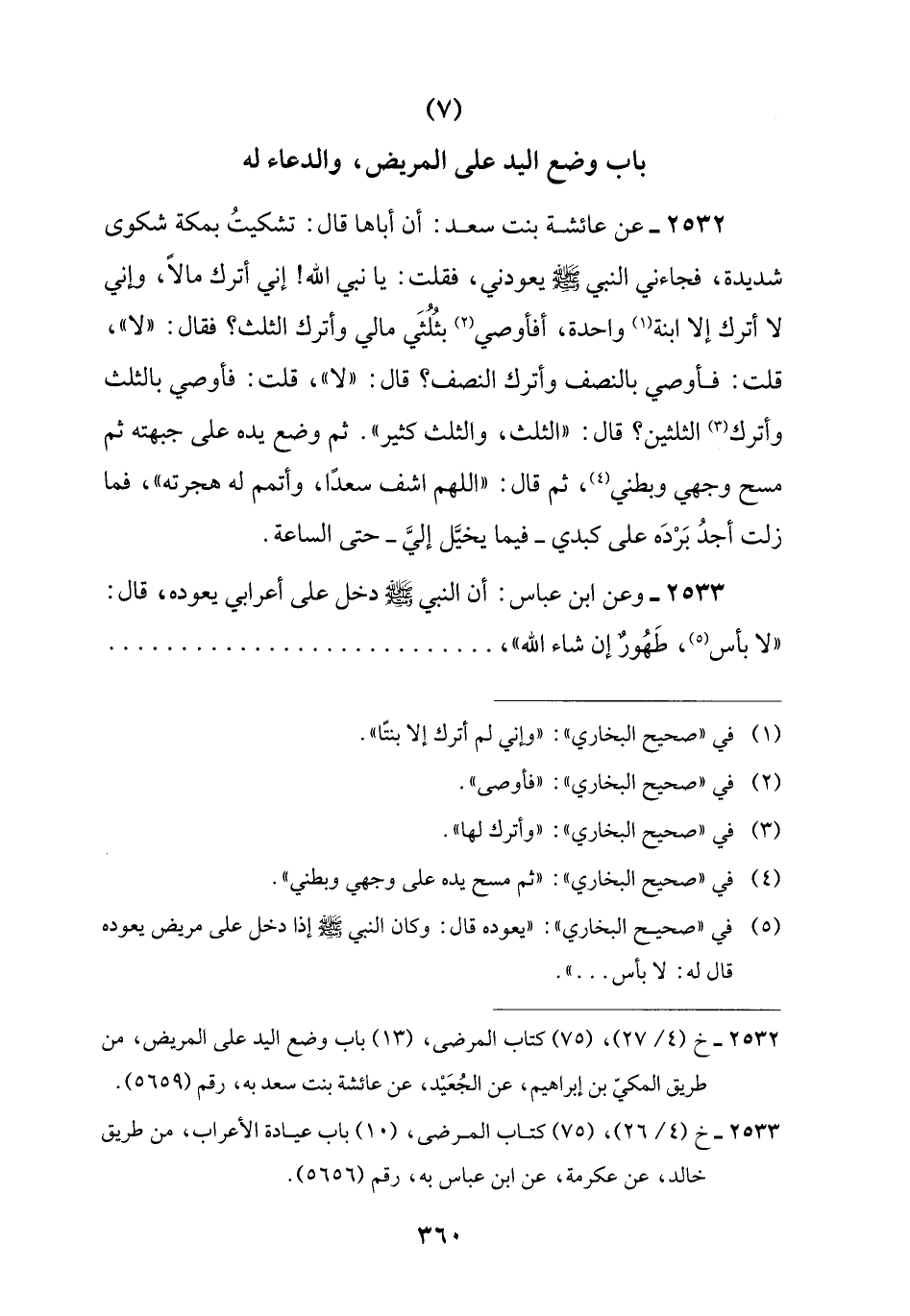 2532 - عن عائشة بنت سعد: أن أباها قال: تشكيتُ بمكة شكوى شديدة، فجاءني النبي -صلى اللَّه عليه وسلم- يعودني، فقلت: يا نبي اللَّه! إني أترك مالًا، وإني لا أترك إلا ابنة (¬1) واحدة، أفأوصي (¬2) بثُلُثَي مالي وأترك الثلث؟ فقال: "لا"، قلت: فأوصي بالنصف وأترك النصف؟ قال: "لا"، قلت: فأوصي بالثلث وأترك (¬3) الثلثين؟ قال: "الثلث، والثلث كثير". ثم وضع يده على جبهته ثم مسح وجهي وبطني (¬4)، ثم قال: "اللهم اشف سعدًا، وأتمم له هجرته"، فما زلت أجدُ بَرْدَه على كبدي -فيما يخيَّل إليَّ- حتى الساعة.