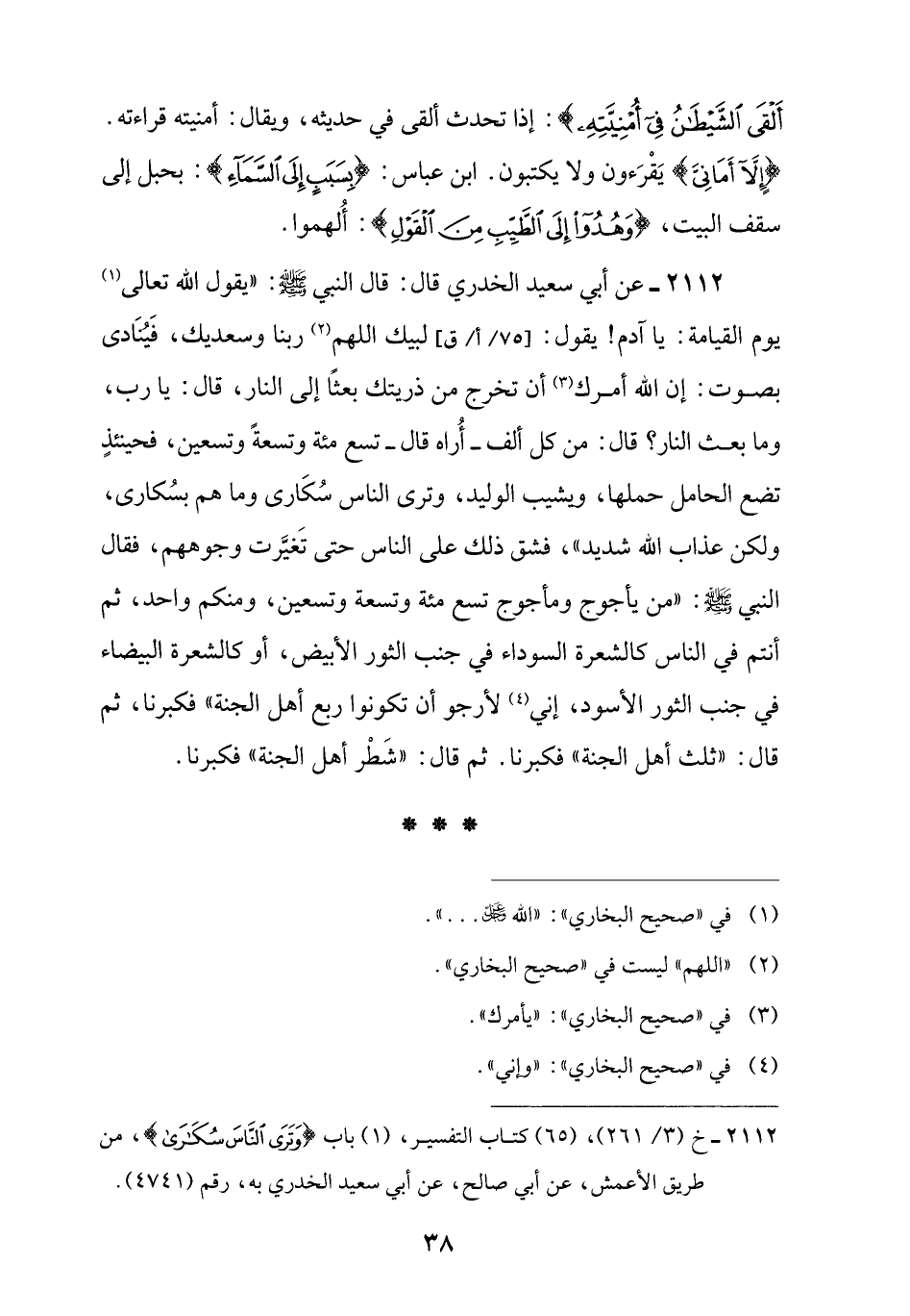 2112 - عن أبي سعيد الخدري قال: قال النبي -صلى اللَّه عليه وسلم-: "يقول اللَّه تعالى (¬1) يوم القيامة: يا آدم! يقول: لبيك اللهم (¬2) ربنا وسعديك، فَيُنَادى بصوت: إن اللَّه أمرك (¬3) أن تخرج من ذريتك بعثًا إلى النار، قال: يارب، وما بعث النار؟ قال: من كل ألف -أُراه قال- تسع مئة وتسعةً وتسعين، فحينئذٍ تضع الحامل حملها، ويشيب الوليد، وترى الناس سُكَارى وما هم بسُكارى، ولكن عذاب اللَّه شديد"، فشق ذلك على الناس حتى تَغيَّرت وجوههم، فقال النبي -صلى اللَّه عليه وسلم-: "من يأجوج ومأجوج تسع مئة وتسعة وتسعين، ومنكم واحد، ثم أنتم في الناس كالشعرة السوداء في جنب الثور الأبيض، أو كالشعرة البيضاء في جنب الثور الأسود، إني (¬4) لأرجو أن تكونوا ربع أهل الجنة" فكبرنا، ثم قال: "ثلث أهل الجنة" فكبرنا. ثم قال: "شَطْر أهل الجنة" فكبرنا.