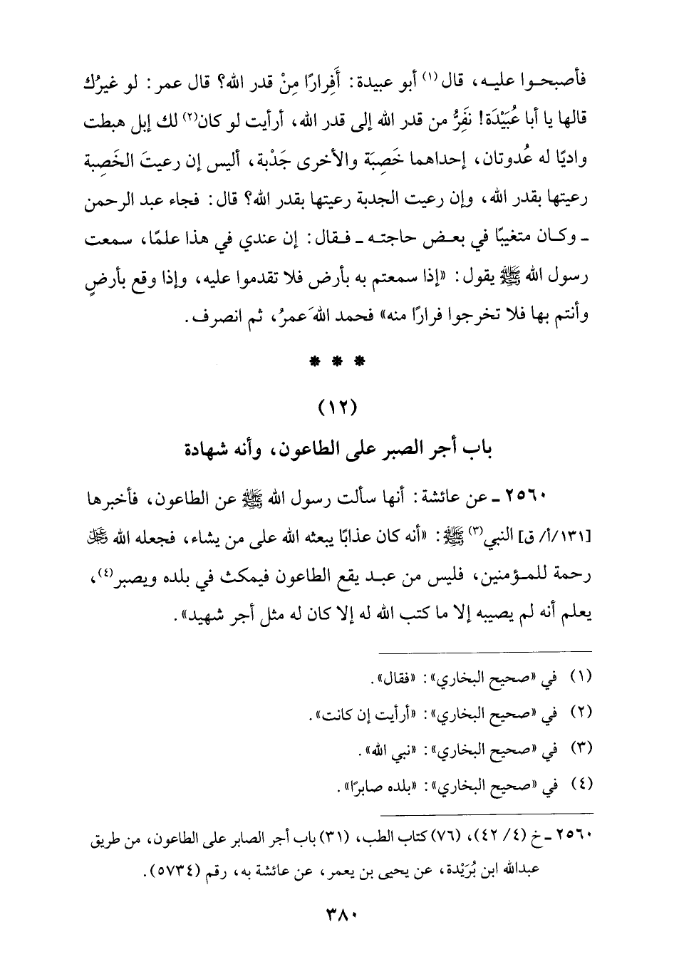 فأصبحوا عليه، قال (¬1) أبو عبيدة: أَفِرارًا مِنْ قدر اللَّه؟ قال عمر: لو غيرُك قالها يا أبا عُبَيْدَة! نفِرُّ من قدر اللَّه إلى قدر اللَّه، أرأيت لو كان (¬2) لك إبل هبطت واديًا له عُدوتان، إحداهما خَصِبَة والأخرى جَدْبة، أليس إن رعيتَ الخَصِبة رعيتها بقدر اللَّه، وإن رعيت الجدبة رعيتها بقدر اللَّه؟ قال: فجاء عبد الرحمن -وكان متغيبًا في بعض حاجته- فقال: إن عندي في هذا علمًا، سمعت رسول اللَّه -صلى اللَّه عليه وسلم- يقول: "إذا سمعتم به بأرض فلا تقدموا عليه، وإذا وقع بأرضٍ وأنتم بها فلا تخرجوا فرارًا منه" فحمد اللَّهَ عمرُ، ثم انصرف.