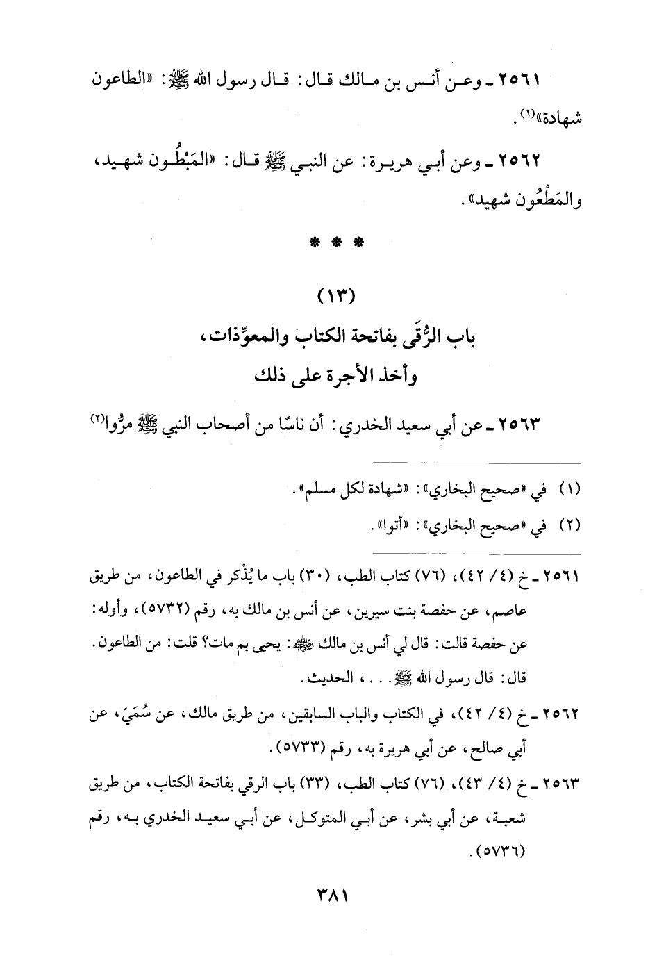 2561 - وعن أنس بن مالك قال: قال رسول اللَّه -صلى اللَّه عليه وسلم-: "الطاعون شهادة" (¬1).