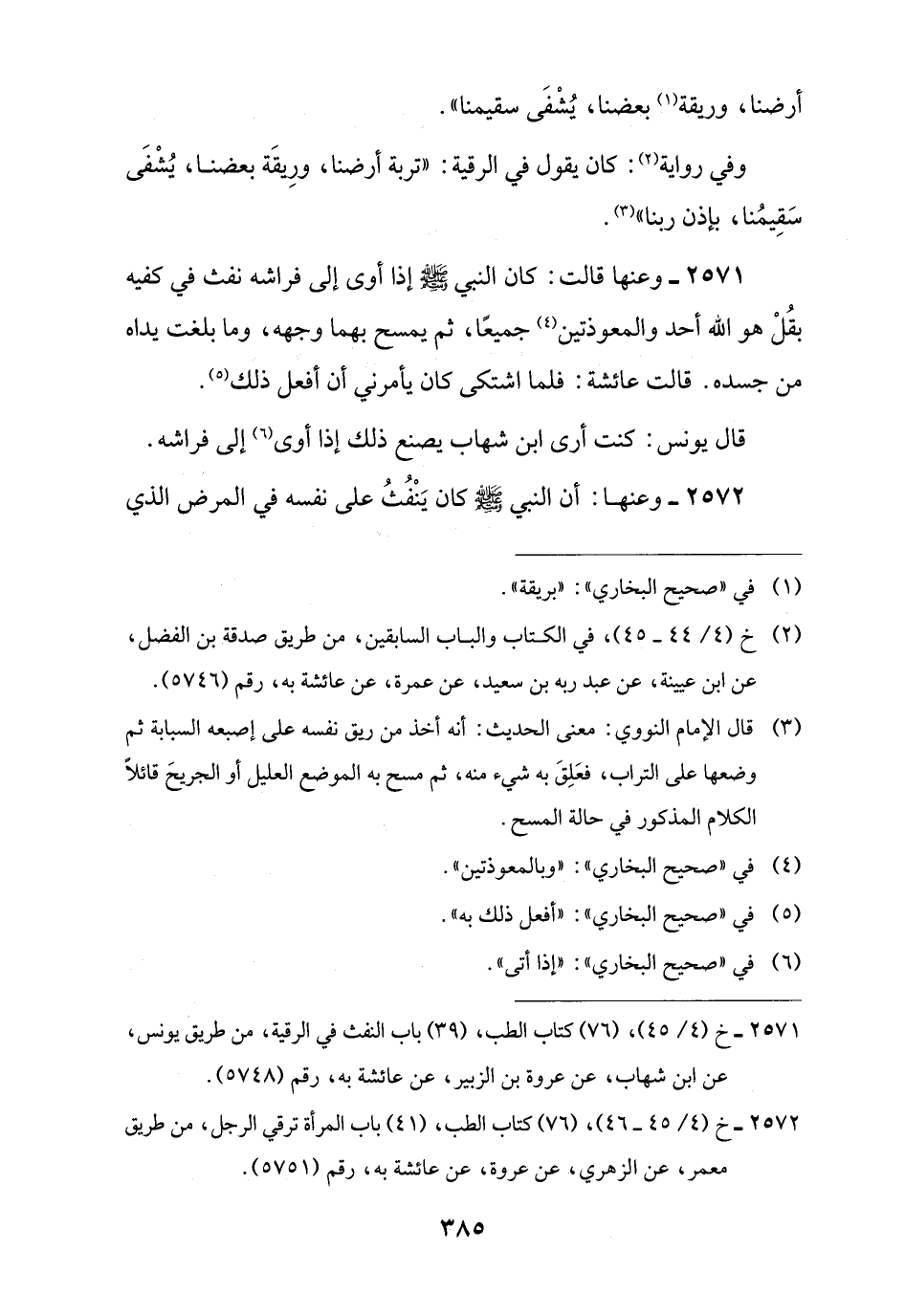 2572 - خ (4/ 45 - 46)، (76) كتاب الطب، (41) باب المرأة ترقي الرجل، من طريق معمر، عن الزهري، عن عروة، عن عائشة به، رقم (5751).