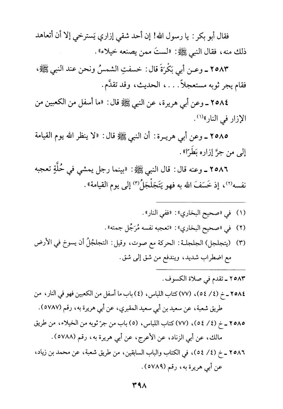 2585 - خ (4/ 54)، (77) كتاب اللباس، (5) باب من جرّ ثوبه من الخيلاء، من طريق مالك، عن أبي الزناد، عن الأعرج، عن أبي هريرة به، رقم (5788).