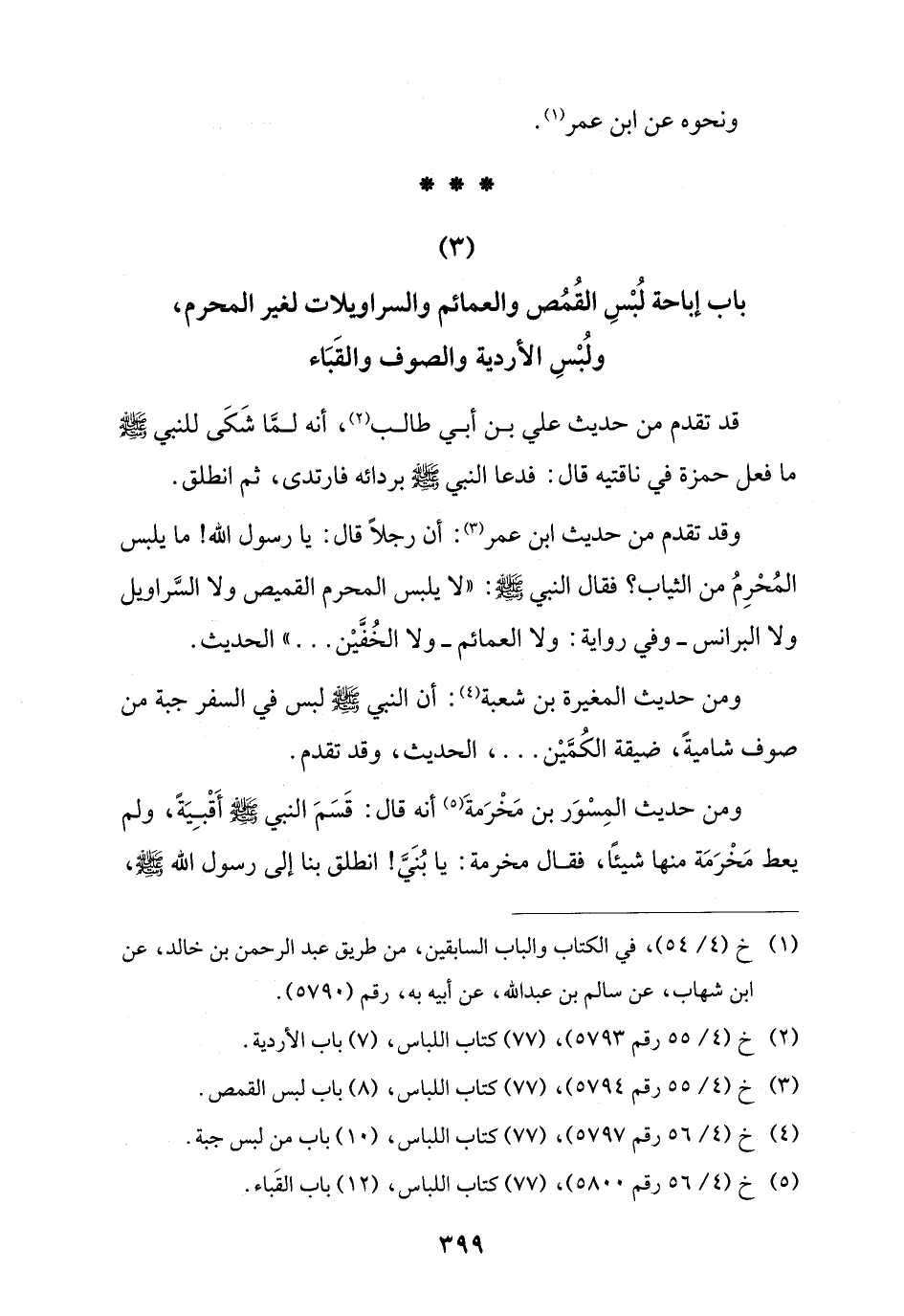 (3) باب إباحة لُبْسِ القُمُص والعمائم والسراويلات لغير المحرم، ولُبْسِ الأردية والصوف والقَبَاء