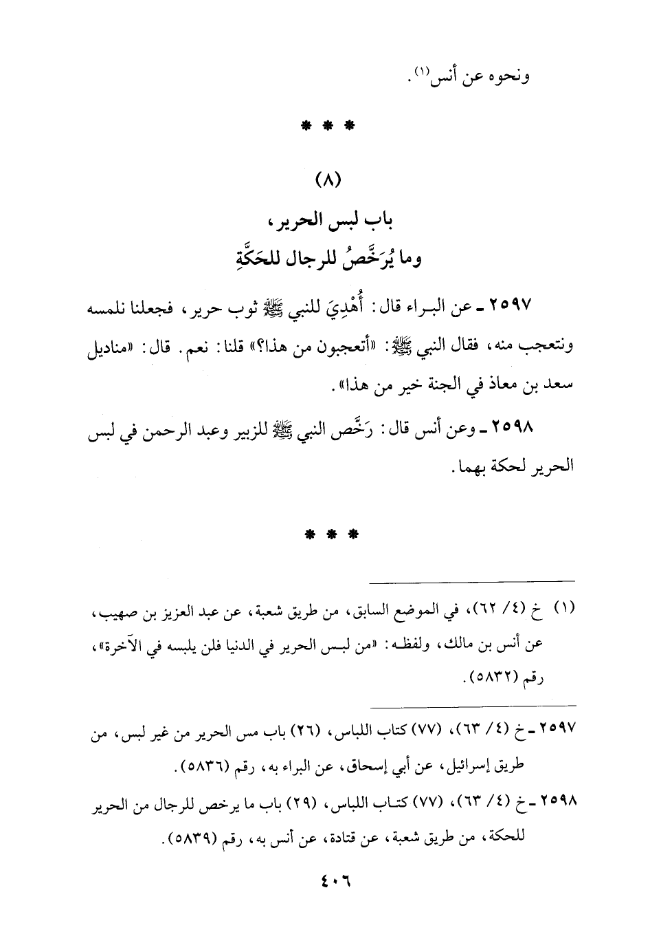 (¬1) خ (4/ 62)، في الموضع السابق، من طريق شعبة، عن عبد العزيز بن صهيب، عن أنس بن مالك، ولفظه: "من لبس الحرير في الدنيا فلن يلبسه في الآخرة"، رقم (5832).