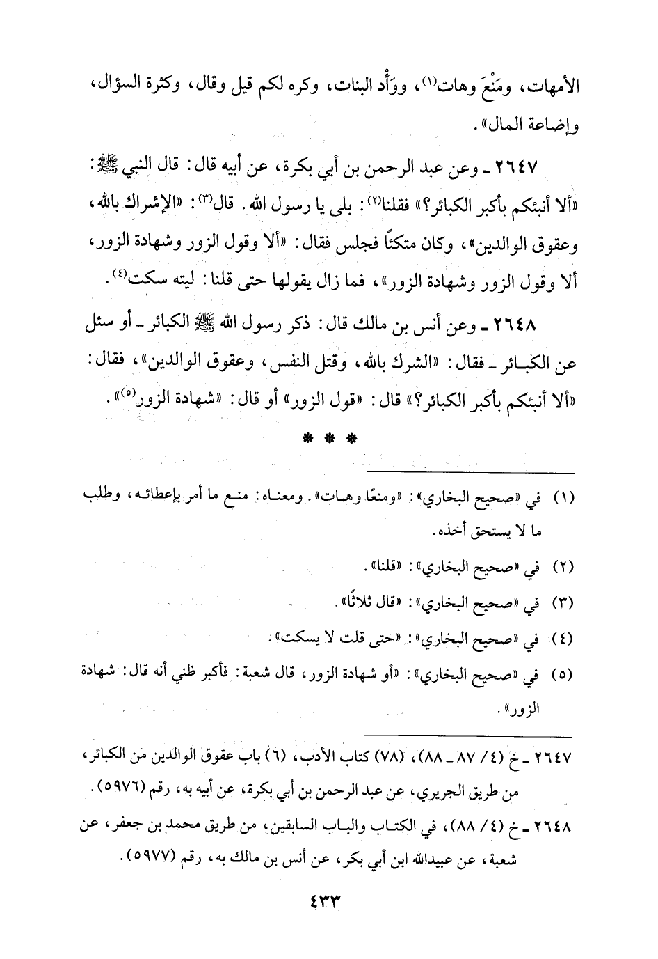 2647 - خ (4/ 87 - 88)، (78) كتاب الأدب، (6) باب عقوق الوالدين من الكبائر، من طريق الجريري، عن عبد الرحمن بن أبي بكرة، عن أبيه به، رقم (5976).