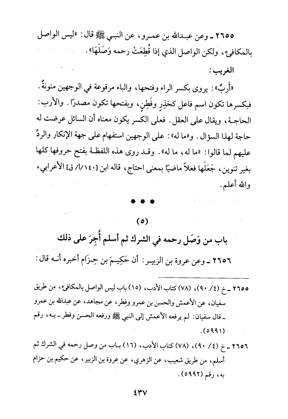 2655 - خ (4/ 90)، (78) كتاب الأدب، (15) باب ليس الواصل بالمكافئ، من طريق سفيان، عن الأعمش والحسن بن عمرو وفِطر، عن مجاهد، عن عبد اللَّه بن عمرو -قال سفيان: لم يرفعه الأعمش إلى النبي -صلى اللَّه عليه وسلم- ورفعه الحسن وفطر- به، رقم (5991).
