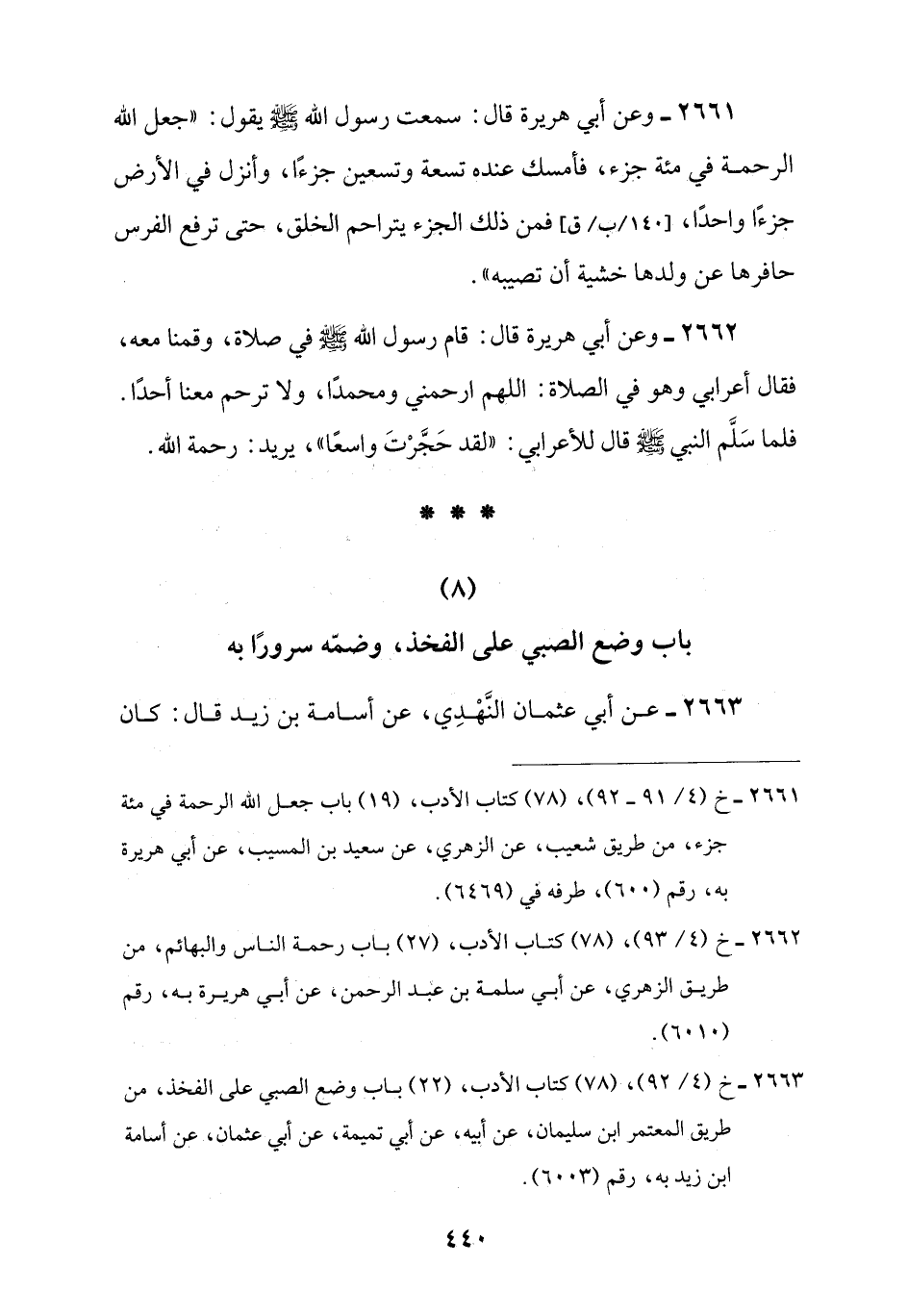 2663 - خ (4/ 92)، (78) كتاب الأدب، (22) باب وضع الصبي على الفخذ، من طريق المعتمر ابن سليمان، عن أبيه، عن أبي تميمة، عن أبي عثمان، عن أسامة ابن زيد به، رقم (6003).