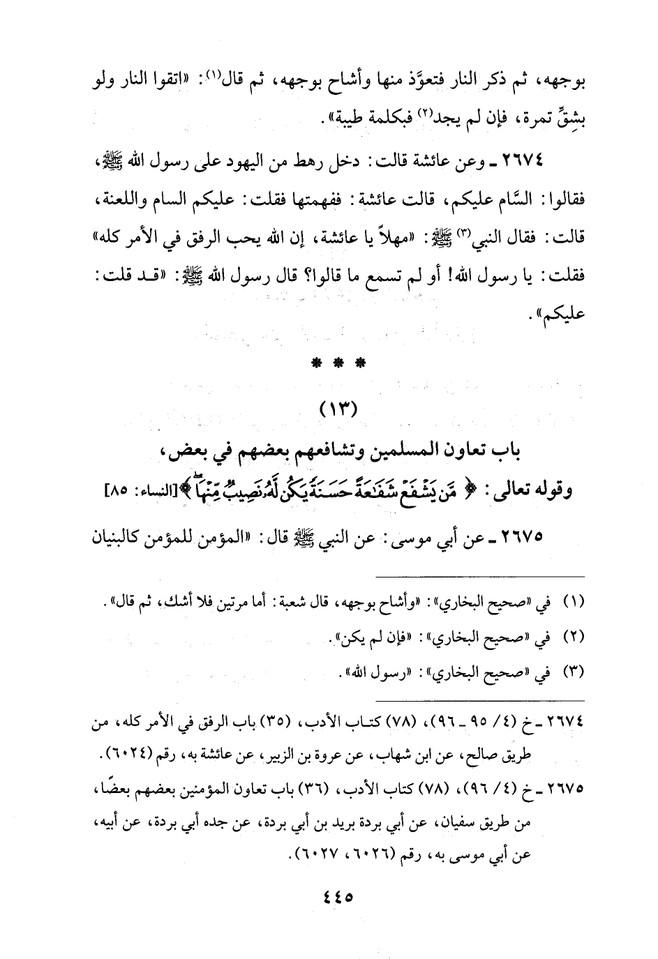 (13) باب تعاون المسلمين وتشافعهم بعضهم في بعض، وقوله تعالى: {مَنْ يَشْفَعْ شَفَاعَةً حَسَنَةً يَكُنْ لَهُ نَصِيبٌ مِنْهَا} [النساء: 85]