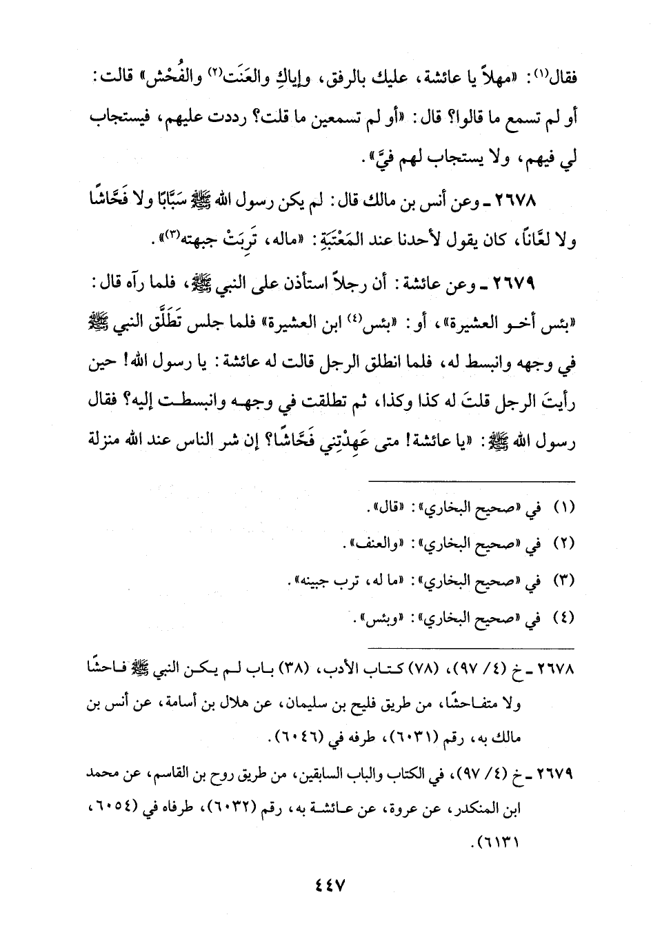2678 - وعن أنس بن مالك قال: لم يكن رسول اللَّه -صلى اللَّه عليه وسلم- سَبَّابًا ولا فَحَّاشًا ولا لعَّانًا، كان يقول لأحدنا عند المَعْتَبَةِ: "ماله، تَرِبَتْ جبهته (¬3) ".