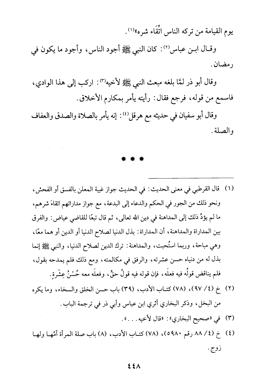 (¬1) قال القرطبي في معنى الحديث: في الحديث جواز غيبة المعلن بالفسق أو الفحش، ونحو ذلك من الجور في الحكم والدعاء إلى البدعة، مع جواز مداراتهم اتقاءَ شرهم، ما لم يؤدِّ ذلك إلى المداهنة في دين اللَّه تعالى، ثم قال تبعًا للقاضي عياض: والفرق بين المداراة والمداهنة، أن المداراة: بذل الدنيا لصلاح الدنيا أو الدين أو هما معًا، وهي مباحة، وربما استُحبت، والمداهنة: ترك الدين لصلاح الدنيا، والنبي -صلى اللَّه عليه وسلم- إنما بذل له من دنياه حسن عشرته، والرفق في مكالمته، ومع ذلك فلم يمدحه بقول، فلم يناقض قولُه فيه فعلَه، فإن قوله فيه قولُ حقٍّ، وفعلَه معه حُسْنُ عِشْرةٍ.