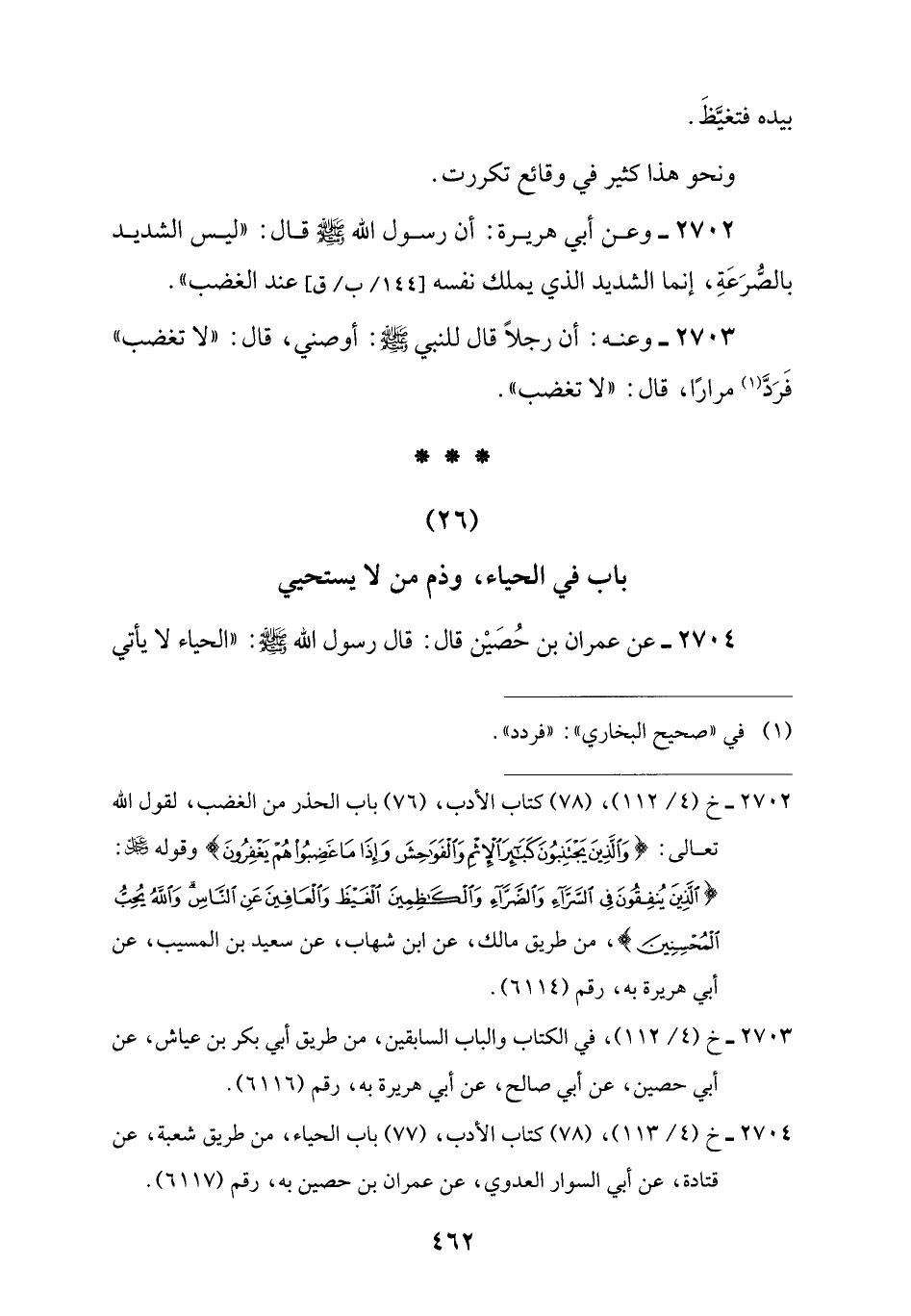 2702 - خ (4/ 112)، (78) كتاب الأدب، (76) باب الحذر من الغضب، لقول اللَّه تعالى: {وَالَّذِينَ يَجْتَنِبُونَ كَبَائِرَ الْإِثْمِ وَالْفَوَاحِشَ وَإِذَا مَا غَضِبُوا هُمْ يَغْفِرُونَ} وقوله عز وجل: {الَّذِينَ يُنْفِقُونَ فِي السَّرَّاءِ وَالضَّرَّاءِ وَالْكَاظِمِينَ الْغَيْظَ وَالْعَافِينَ عَنِ النَّاسِ وَاللَّهُ يُحِبُّ الْمُحْسِنِينَ}، من طريق مالك، عن ابن شهاب، عن سعيد بن المسيب، عن أبي هريرة به، رقم (6114).