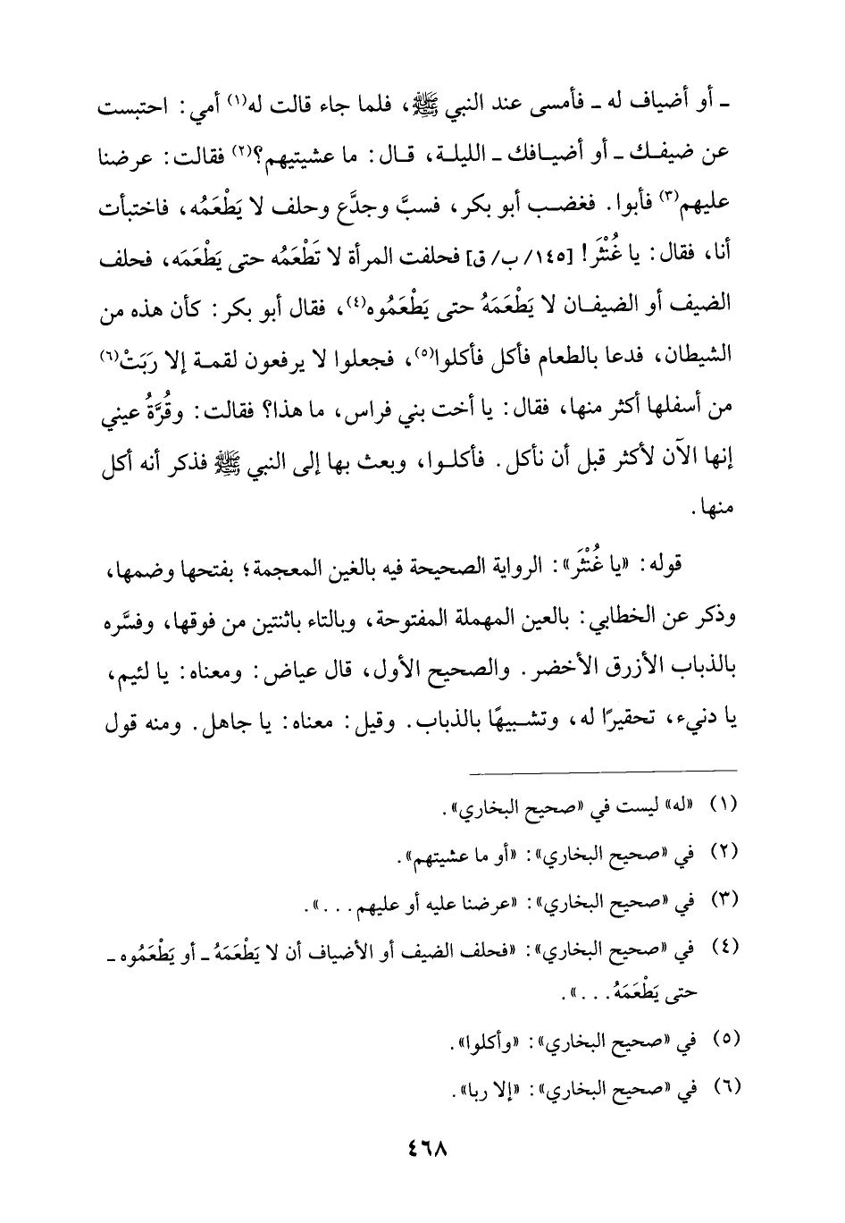 (¬4) في "صحيح البخاري": "فحلف الضيف أو الأضياف أن لا يَطْعَمَهُ -أو يَطْعَمُوه- حتى يَطْعَمَهُ. . . ".