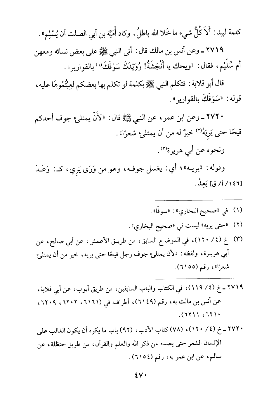 2720 - وعن ابن عمر، عن النبي -صلى اللَّه عليه وسلم- قال: "لأَنْ يمتلئ جوف أحدكم قيحًا حتى يَرِيَهُ (¬2) خيرٌ له من أن يمتلئ شعرًا".