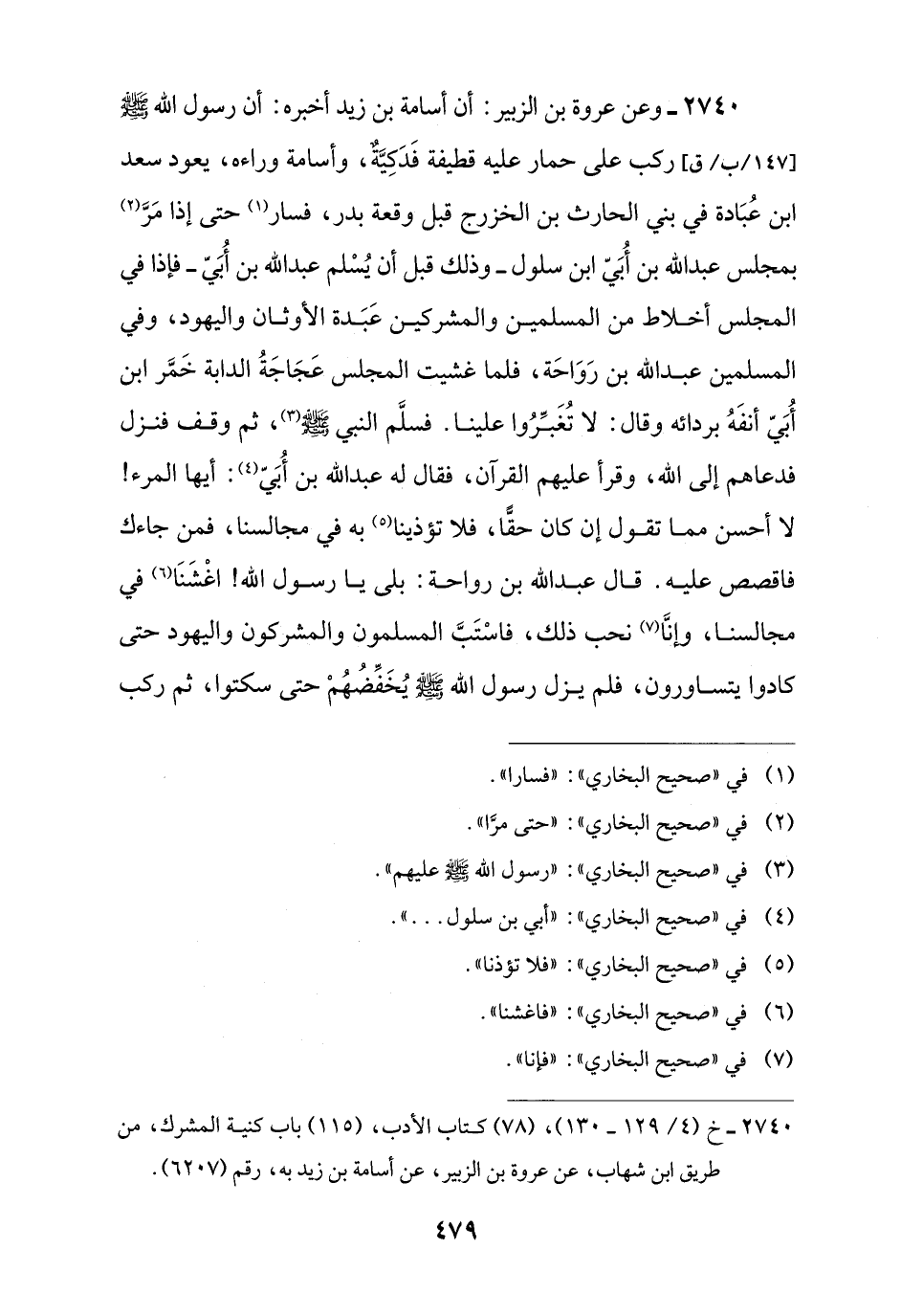 2740 - خ (4/ 129 - 130)، (78) كتاب الأدب، (115) باب كنية المشرك، من طريق ابن شهاب، عن عروة بن الزبير، عن أسامة بن زيد به، رقم (6207).