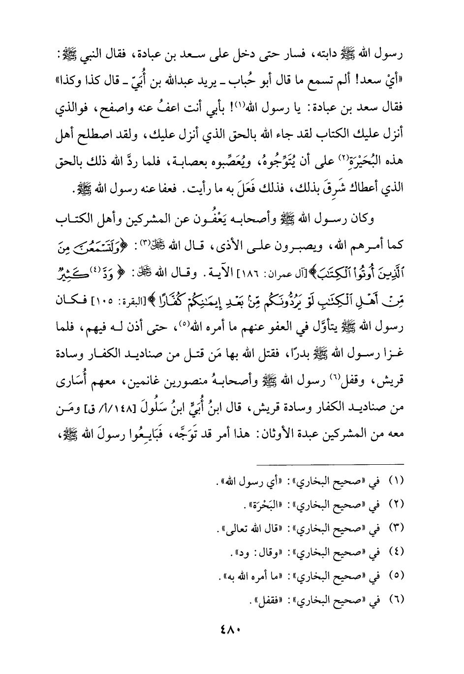 رسول اللَّه -صلى اللَّه عليه وسلم- دابته، فسار حتى دخل على سعد بن عبادة، فقال النبي -صلى اللَّه عليه وسلم-: "أيْ سعد! ألم تسمع ما قال أبو حُباب -يريد عبد اللَّه بن أُبَيّ- قال كذا وكذا" فقال سعد بن عبادة: يا رسول اللَّه (¬1)! بأبي أنت اعفُ عنه واصفح، فوالذي أنزل عليك الكتاب لقد جاء اللَّه بالحق الذي أنزل عليك، ولقد اصطلح أهل هذه البُحَيْرَةِ (¬2) على أن يُتَوِّجُوهُ، ويُعَصِّبوه بعصابة، فلما ردَّ اللَّه ذلك بالحق الذي أعطاك شَرِقَ بذلك، فذلك فَعَلَ به ما رأيت. فعفا عنه رسول اللَّه -صلى اللَّه عليه وسلم-.