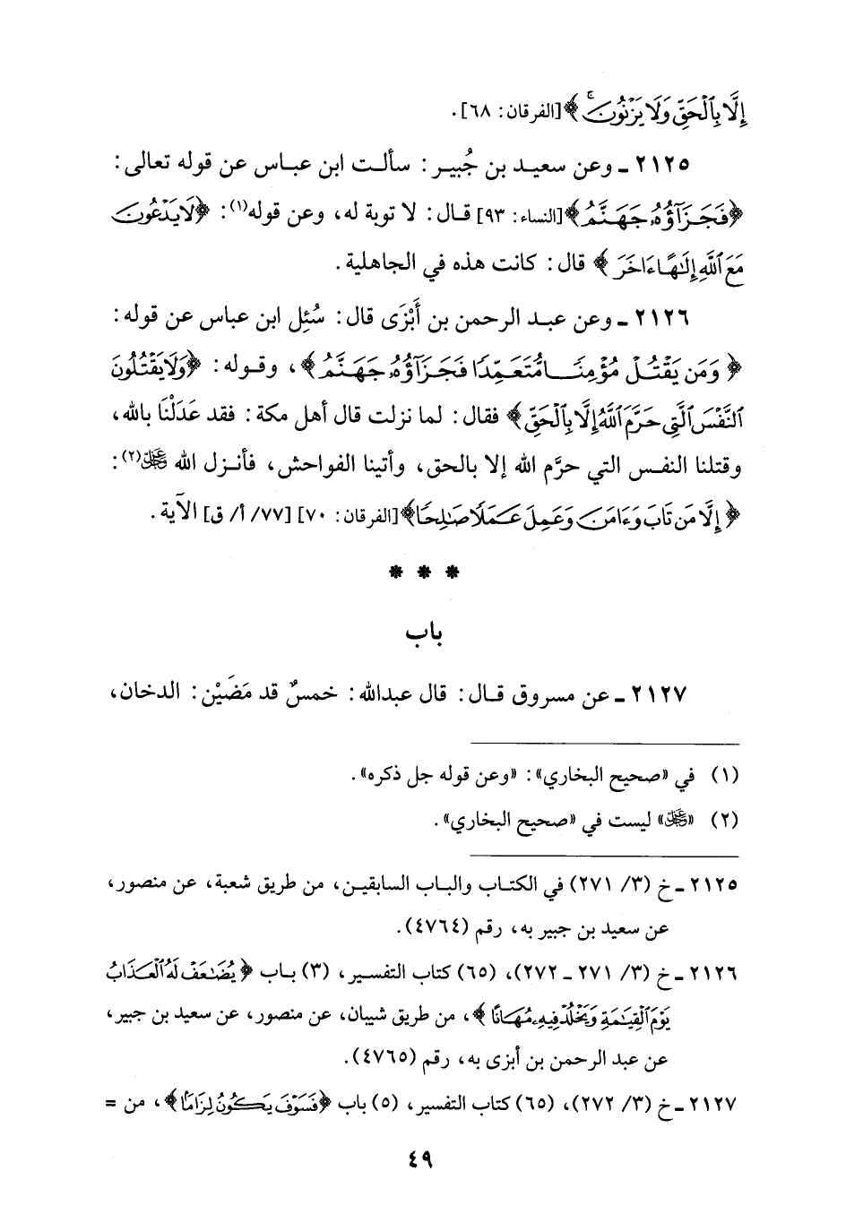 2125 - وعن سعيد بن جُبير: سألت ابن عباس عن قوله تعالى: {فَجَزَاؤُهُ جَهَنَّمُ} [النساء: 93] قال: لا توية له، وعن قوله (¬1): {لَا يَدْعُونَ مَعَ اللَّهِ إِلَهًا آخَرَ} قال: كانت هذه في الجاهلية.