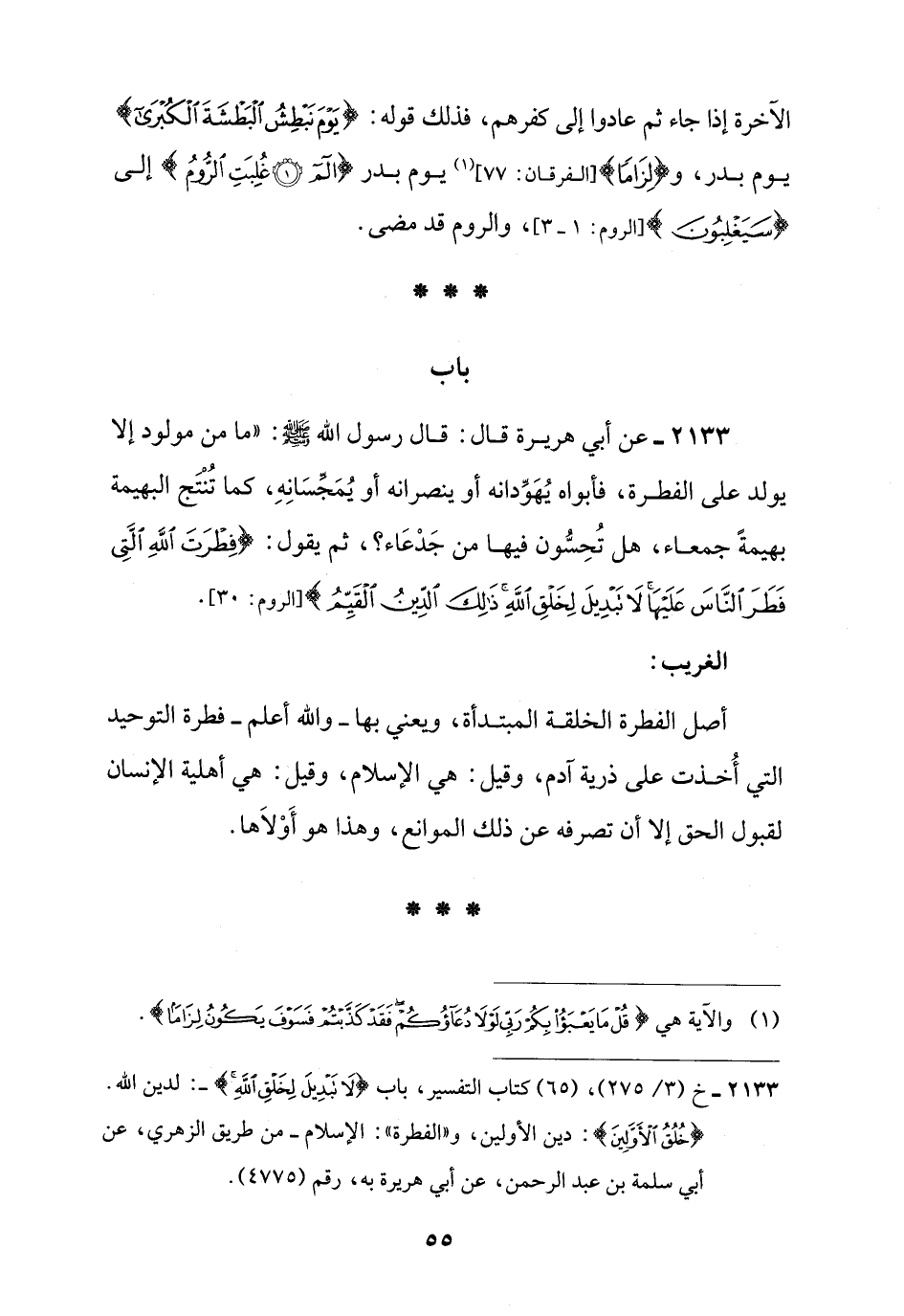 2133 - عن أبي هريرة قال: قال رسول اللَّه -صلى اللَّه عليه وسلم-: "ما من مولود إلا يولد على الفطرة، فأبواه يُهَوِّدانه أو ينصرانه أو يُمَجِّسَانِهِ، كما تُنْتَج البهيمة بهيمةً جمعاء، هل تُحِسُّون فيها من جَدْعَاء؟ ، ثم يقول: {فِطْرَتَ اللَّهِ الَّتِي فَطَرَ النَّاسَ عَلَيْهَا لَا تَبْدِيلَ لِخَلْقِ اللَّهِ ذَلِكَ الدِّينُ الْقَيِّمُ} [الروم: 30].