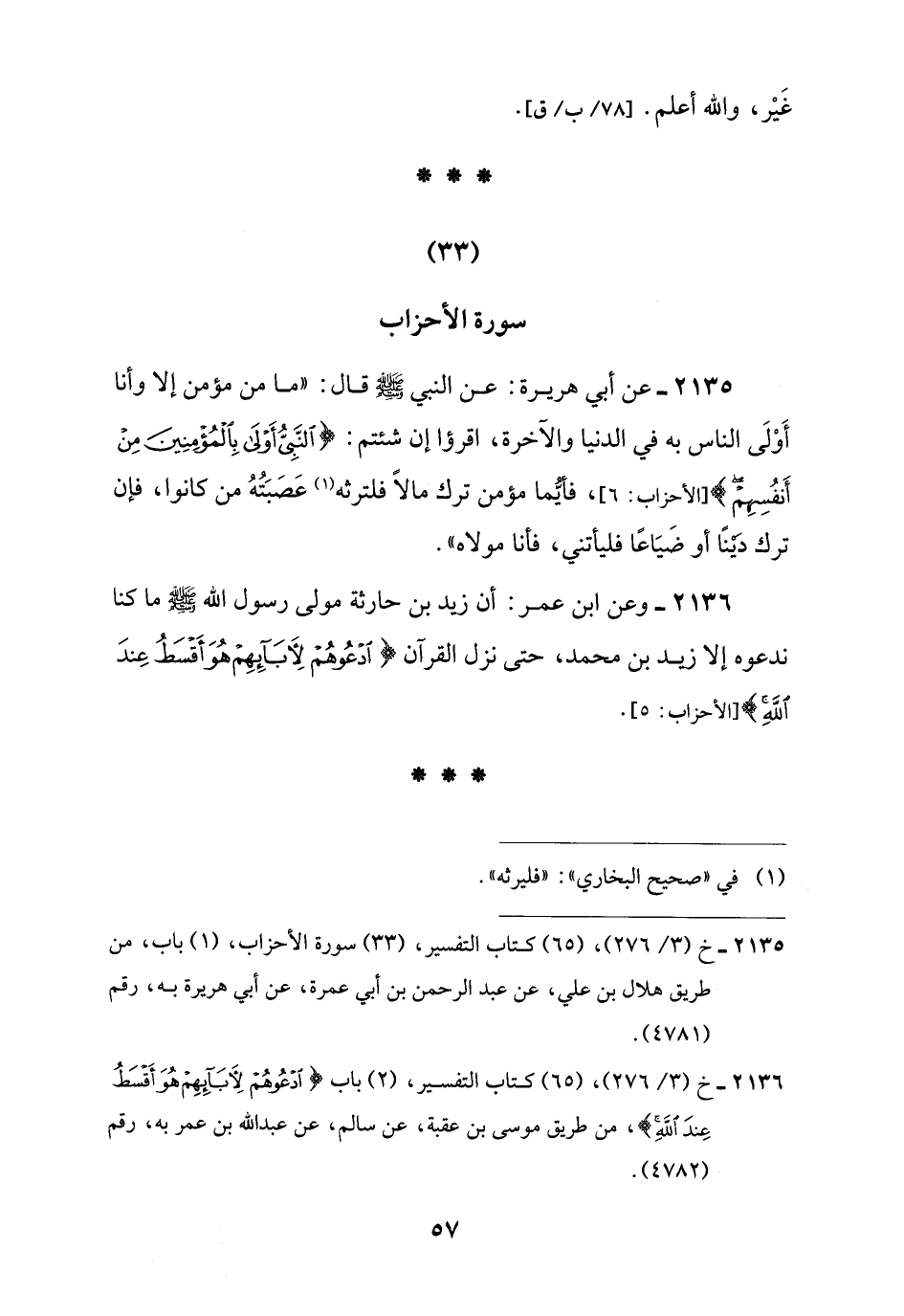 2136 - وعن ابن عمر: أن زيد بن حارثة مولى رسول اللَّه -صلى اللَّه عليه وسلم- ما كنا ندعوه إلا زيد بن محمد، حتى نزل القرآن {ادْعُوهُمْ لِآبَائِهِمْ هُوَ أَقْسَطُ عِنْدَ اللَّهِ} [الأحزاب: 5].