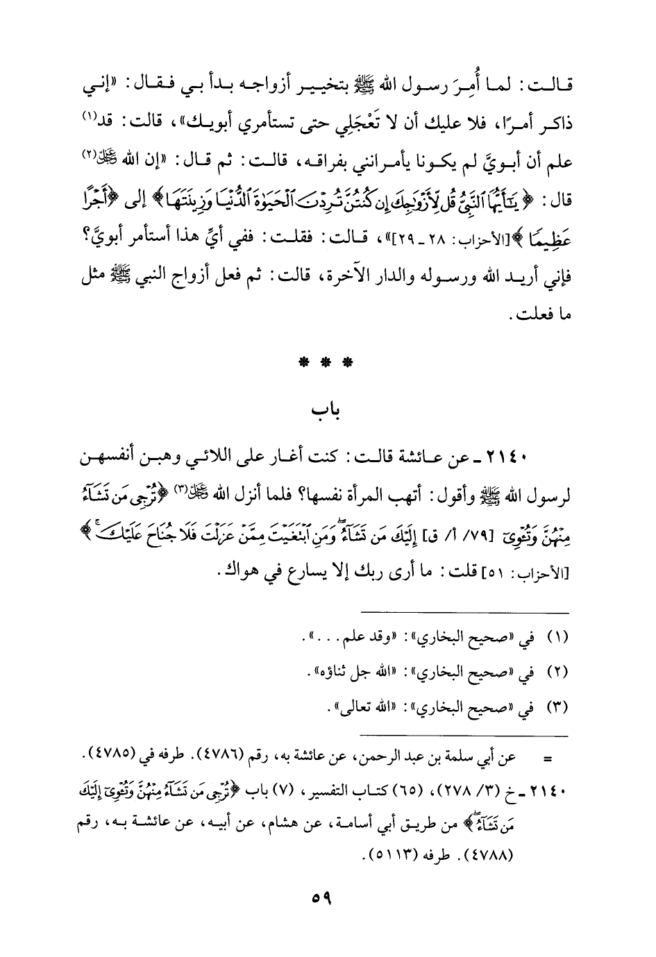 2140 - خ (3/ 278)، (65) كتاب التفسير، (7) باب {تُرْجِي مَنْ تَشَاءُ مِنْهُنَّ وَتُؤْوِي إِلَيْكَ مَنْ تَشَاءُ} من طريق أبي أسامة، عن هشام، عن أبيه، عن عائشة به، رقم (4788). طرفه (5113).
