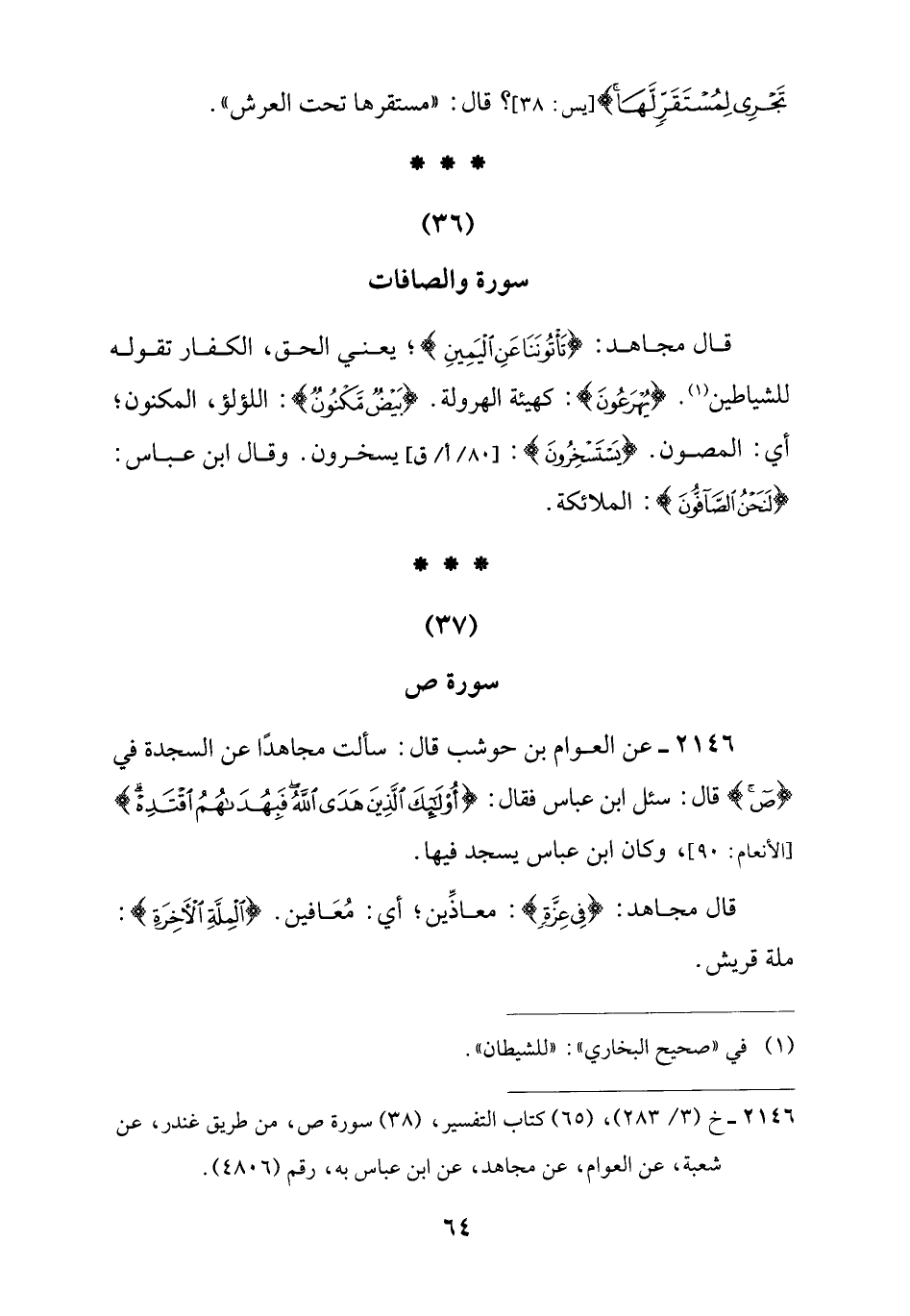 2146 - خ (3/ 283)، (65) كتاب التفسير، (38) سورة ص، من طريق غندر، عن شعبة، عن العوام، عن مجاهد، عن ابن عباس به، رقم (4806).