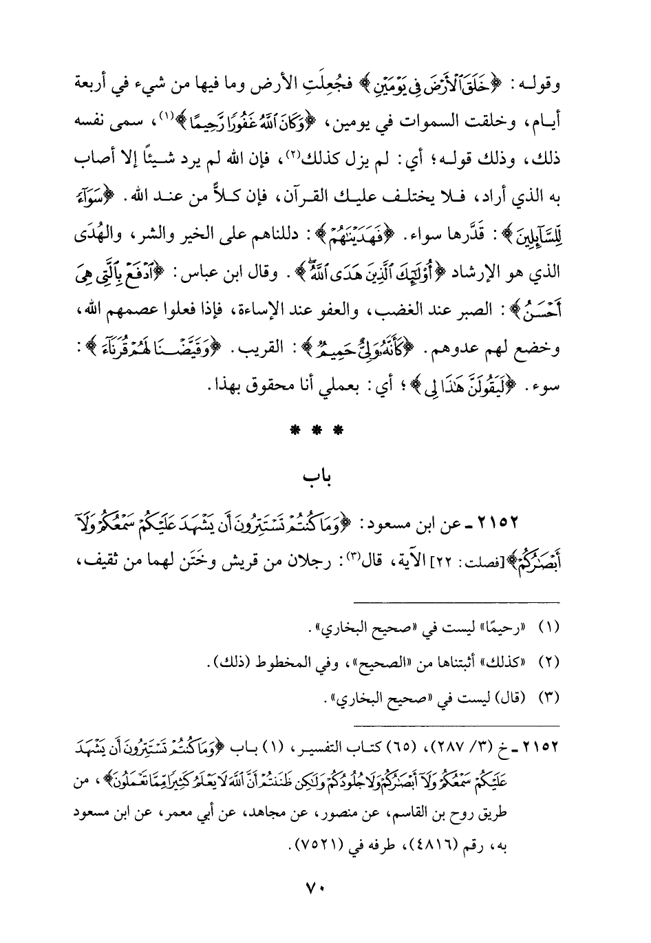 2152 - عن ابن مسعود: {وَمَا كُنْتُمْ تَسْتَتِرُونَ أَنْ يَشْهَدَ عَلَيْكُمْ سَمْعُكُمْ وَلَا أَبْصَارُكُمْ} [فصلت: 22] الآية، قال (¬3): رجلان من قريش وخَتَن لهما من ثقيف،