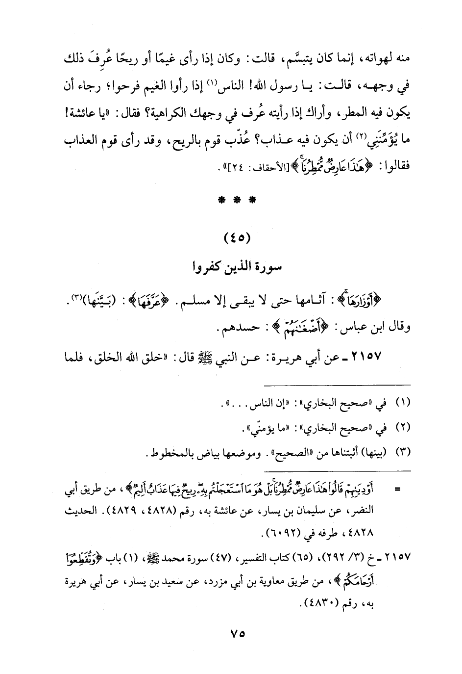 = أَوْدِيَتِهِمْ قَالُوا هَذَا عَارِضٌ مُمْطِرُنَا بَلْ هُوَ مَا اسْتَعْجَلْتُمْ بِهِ رِيحٌ فِيهَا عَذَابٌ أَلِيمٌ}، من طريق أبي النضر، عن سليمان بن يسار، عن عائشة به، رقم (4828، 4829). الحديث 4828، طرفه في (6092).