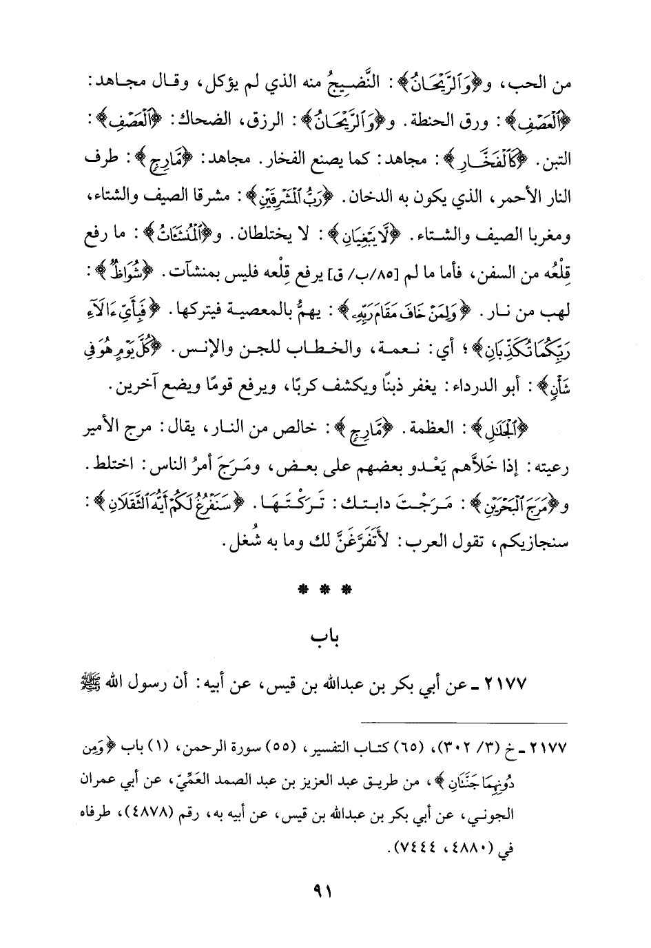 من الحب، و {وَالرَّيْحَانُ}: النَّضِيجُ منه الذي لم يؤكل، وقال مجاهد: {الْعَصْفِ}: ورق الحنطة. و {وَالرَّيْحَانُ}: الرزق، الضحاك: {الْعَصْفِ}: التبن. {كَالْفَخَّارِ}: مجاهد: كما يصنع الفخار. مجاهد: {مَارِجٍ}: طرف النار الأحمر، الذي يكون به الدخان. {رَبُّ الْمَشْرِقَيْنِ}: مشرقا الصيف والشتاء، ومغربا الصيف والشتاء. {لَا يَبْغِيَانِ}: لا يختلطان. و {الْمُنْشَآتُ}: ما رفع قِلْعُه من السفن، فأما ما لم يرفع قِلْعه فليس بمنشآت. {شُوَاظٌ}: لهب من نار. {وَلِمَنْ خَافَ مَقَامَ رَبِّهِ}: يهمُّ بالمعصية فيتركها. {فَبِأَيِّ آلَاءِ رَبِّكُمَا تُكَذِّبَانِ}؛ أي: نعمة، والخطاب للجن والإنس. {كُلَّ يَوْمٍ هُوَ فِي شَأْنٍ}: أبو الدرداء: يغفر ذبنًا ويكشف كربًا، ويرفع قومًا ويضع آخرين.