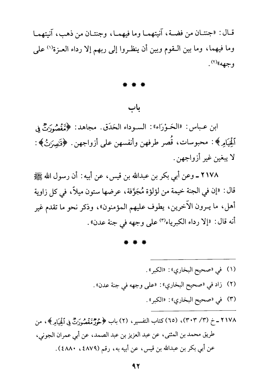 2178 - خ (3/ 303)، (65) كتاب التفسير، (2) باب {حُورٌ مَقْصُورَاتٌ فِي الْخِيَامِ} [الرحمن: 72]، من طريق محمد بن المثنى، عن عبد العزيز بن عبد الصمد، عن أبي عمران الجوني، عن أبي بكر بن عبد اللَّه بن قيس، عن أبيه به، رقم (4879، 4880).