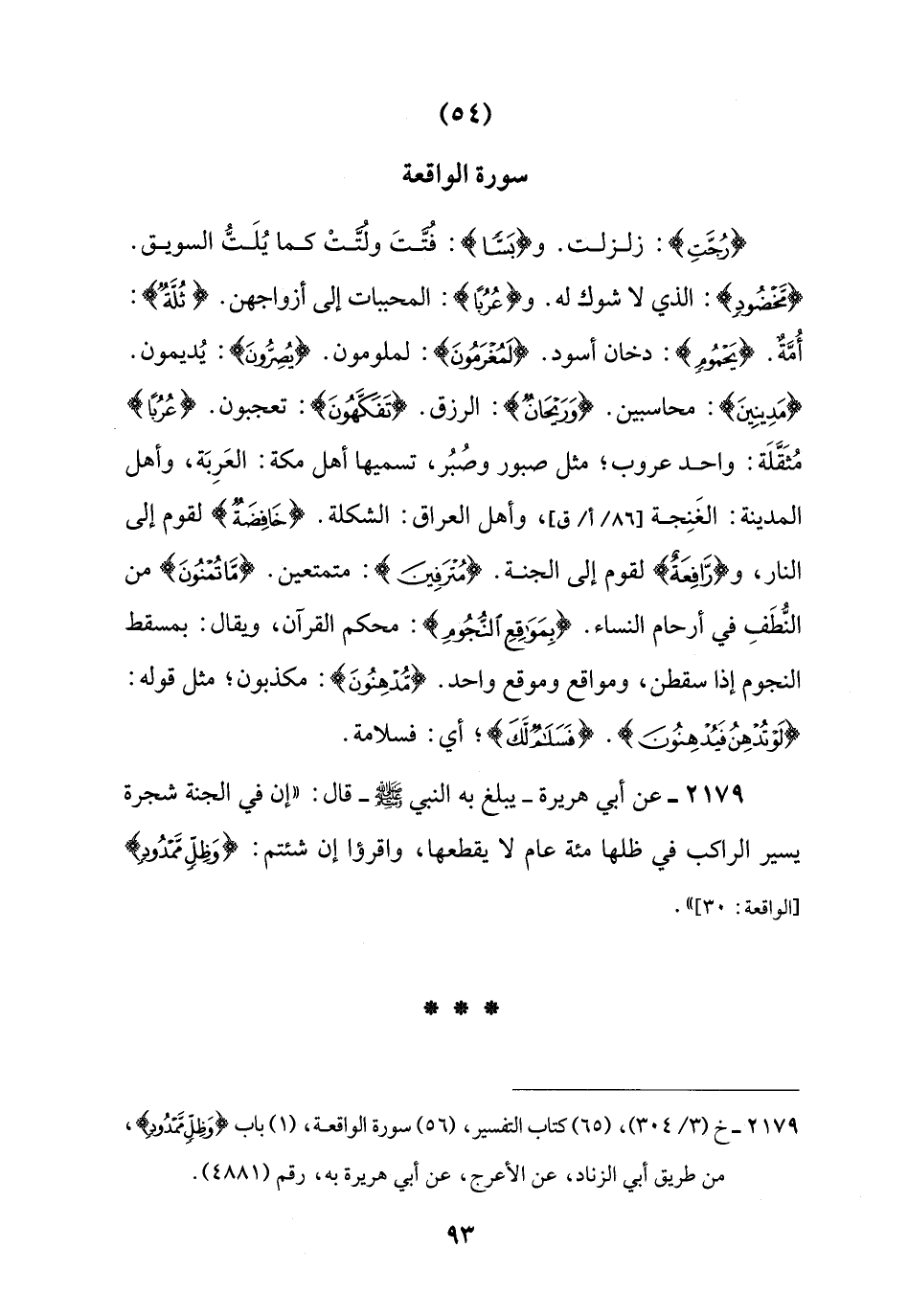 2179 - خ (3/ 304)، (65) كتاب التفسير، (56) سورة الواقعة، (1) باب {وَظِلٍّ مَمْدُودٍ}، من طريق أبي الزناد، عن الأعرج، عن أبي هريرة به، رقم (4881).