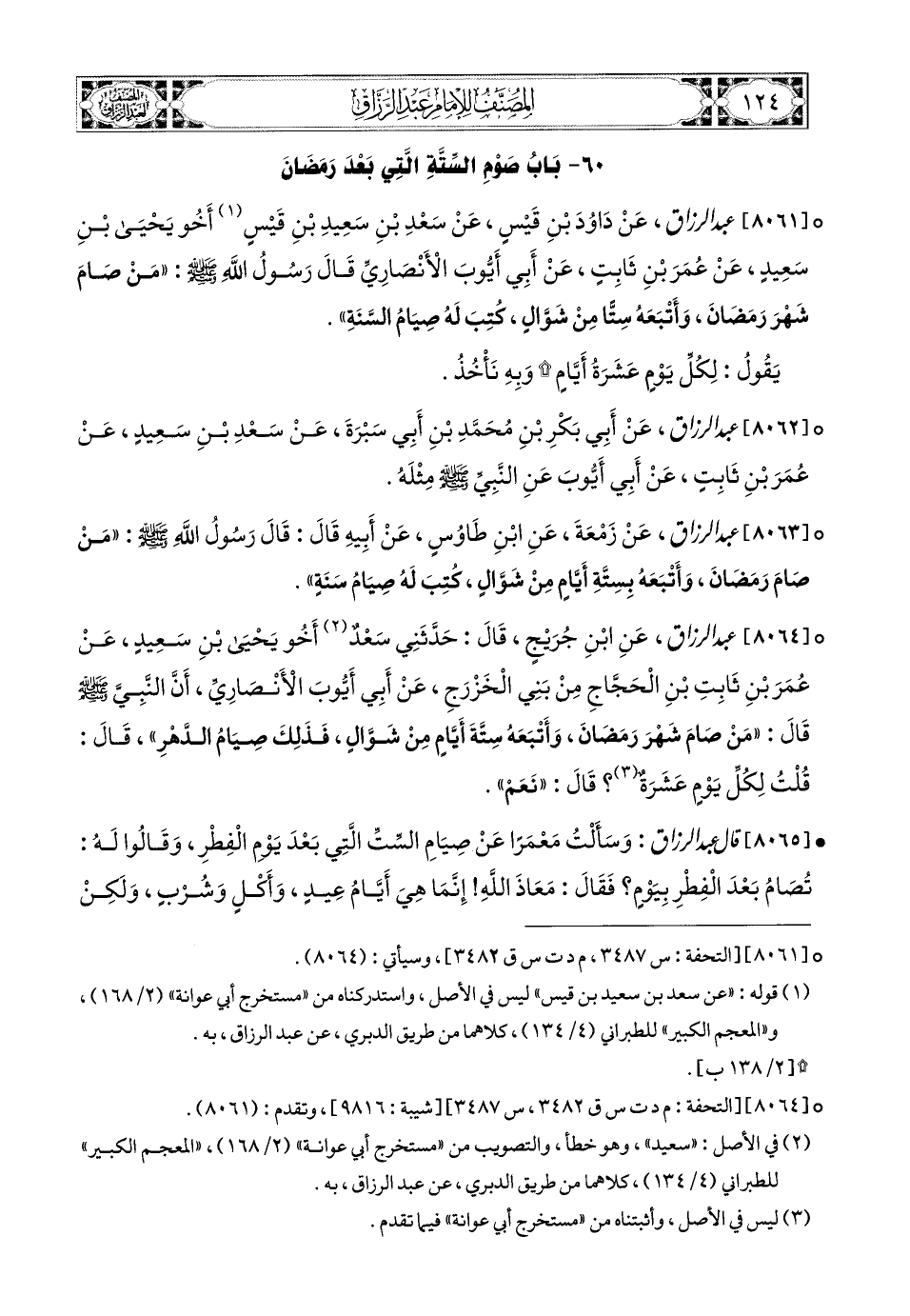 8061- عبد الرزاق، عَن دَاوُدَ بْنِ قَيْسٍ، عَن سَعْدِ بْنِ سَعيدِ بْنِ قَيْسٍ، أَخُو يَحيَى بنِ سَعيدٍ، عَن عُمَرَ بْنِ ثَابِتٍ، عَنْ أَبِي أَيُّوبَ الأَنْصَارِيِّ، قَالَ رَسُولُ اللهِ صَلَّى اللهُ عَلَيْهِ وَسَلَّمَ: مَنْ صَامَ شَهْرَ رَمَضَانَ، وَأَتْبَعَهُ سِتًّا مِنْ شَوَّالٍ كُتِبَ لَهُ صِيَامُ السَّنَةِ يَقُولُ: لِكُلِّ يَوْمٍ عَشَرَةُ أَيَّامٍ.